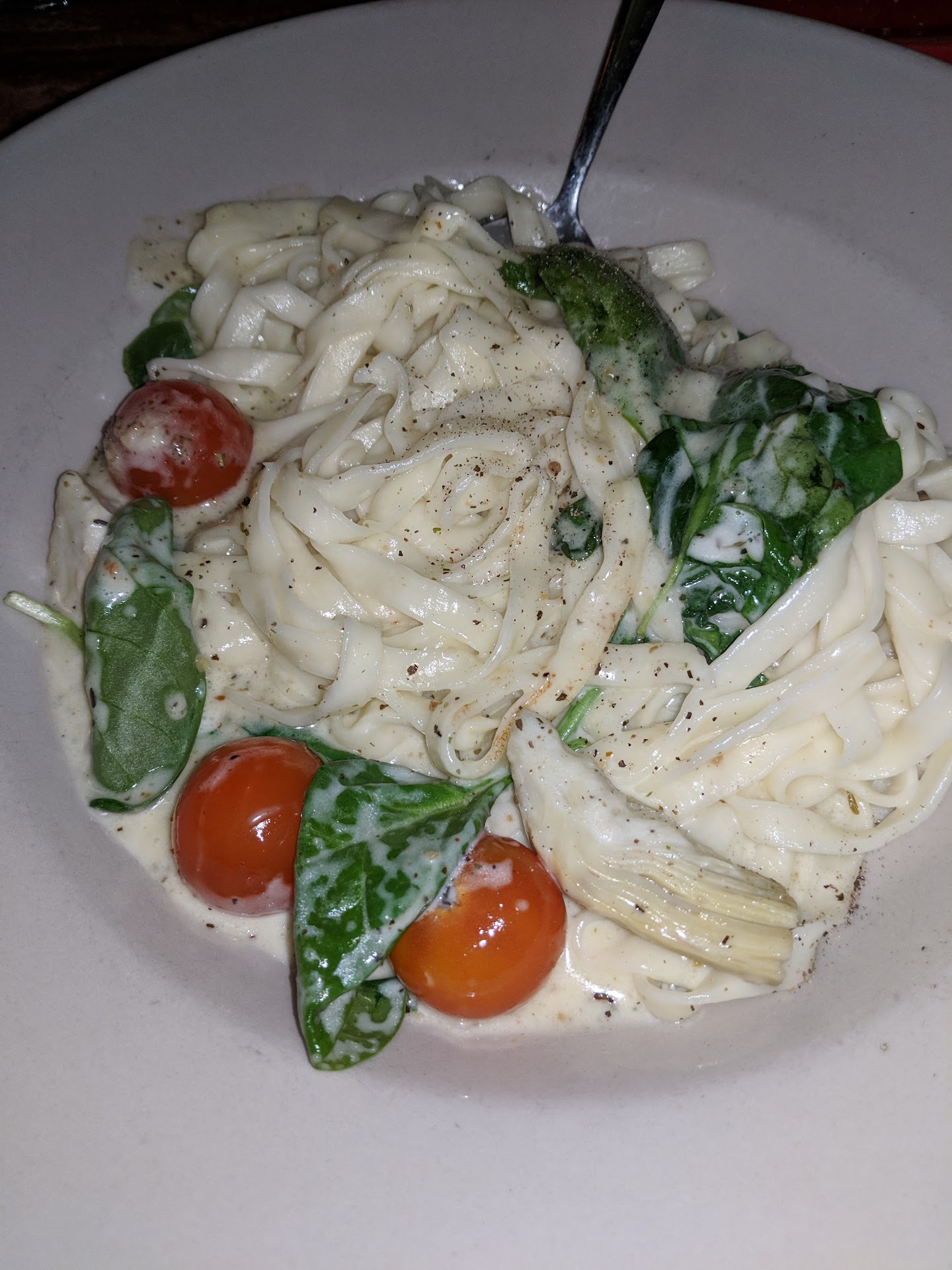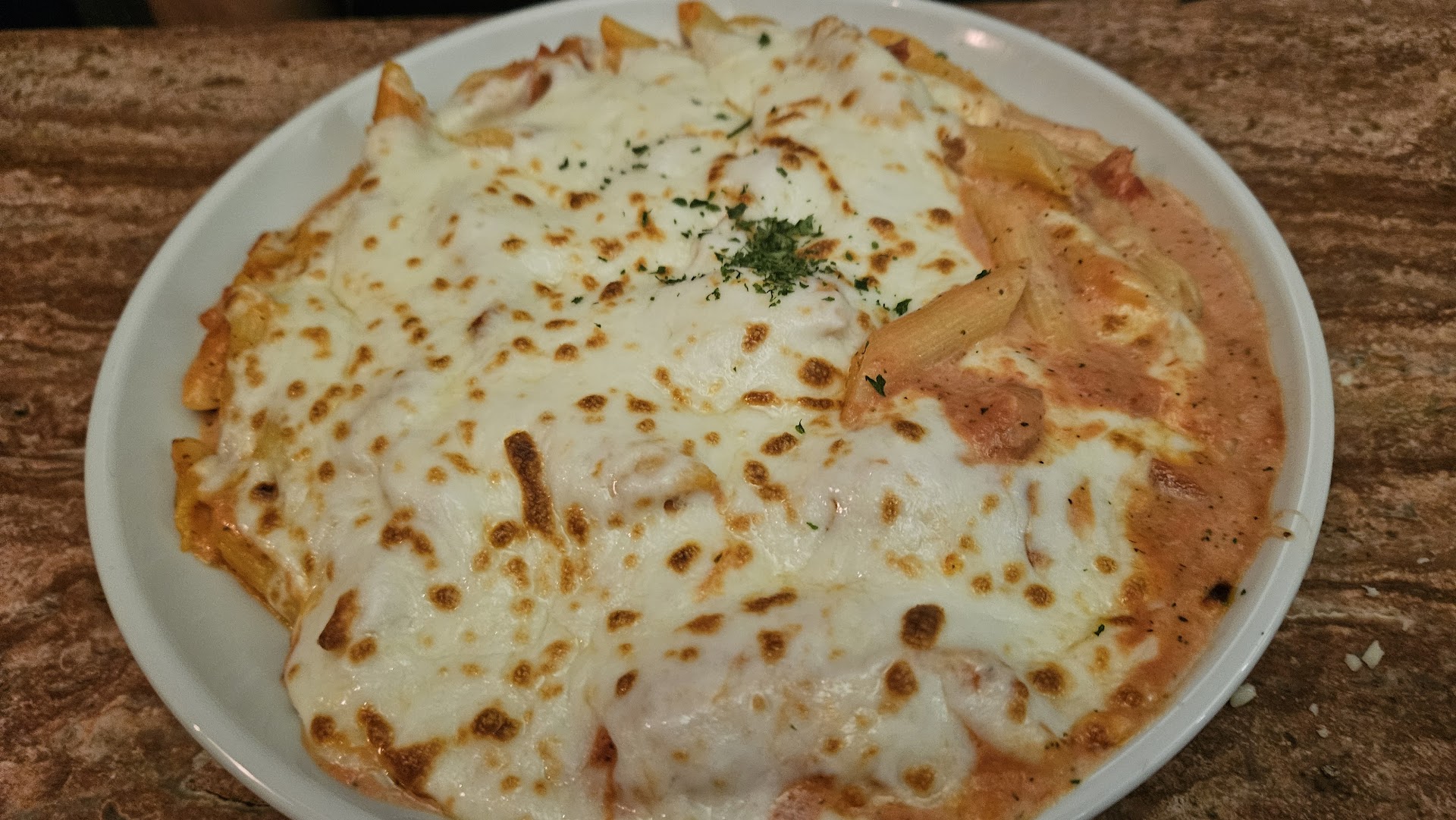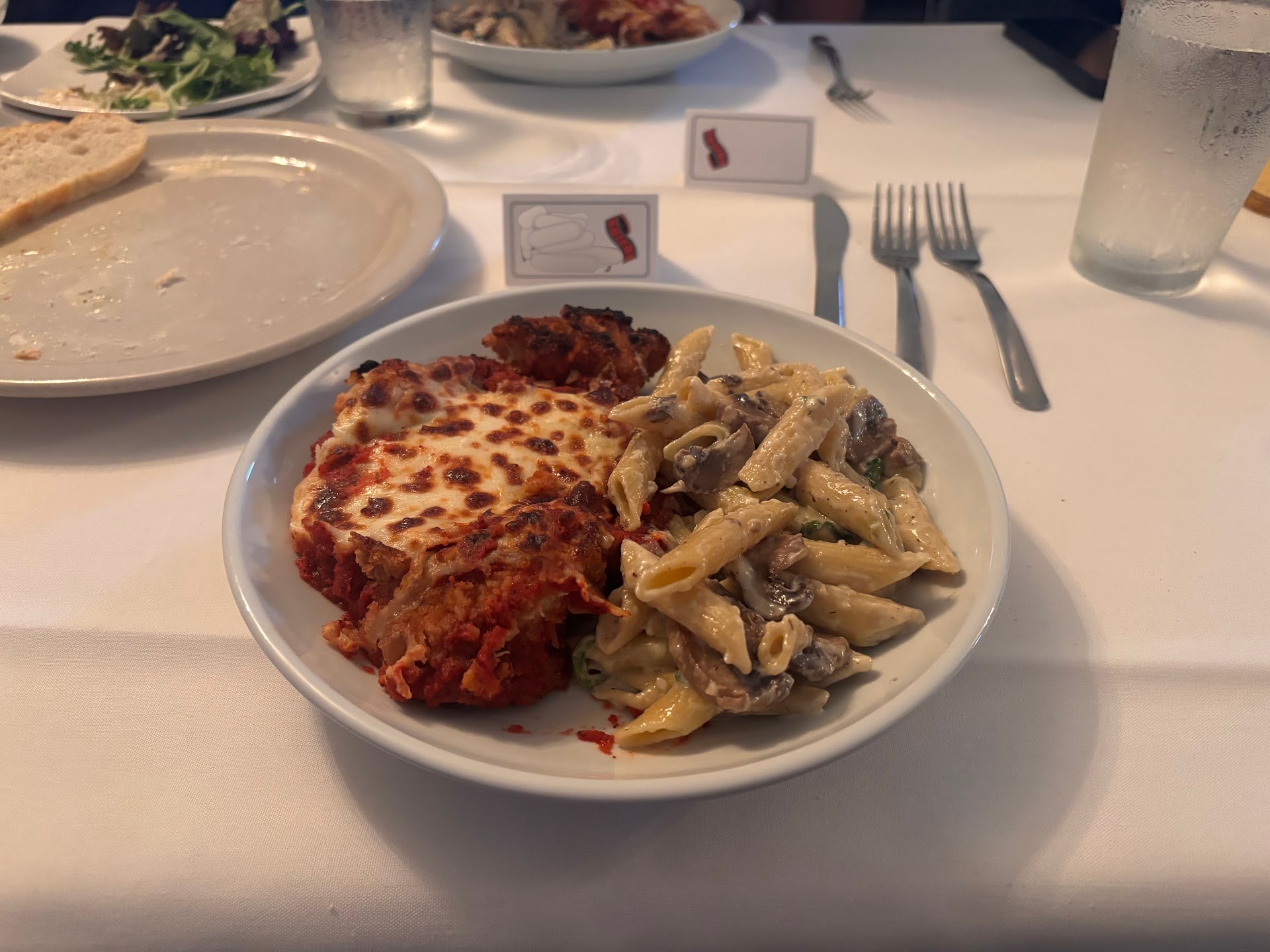 My friends who had been here before ordered "The Lobster" which is a penne with cream sauce topped with chunks of lobster, very good sauce, but there wasn't nearly enough of it. My chicken parmesan on the other hand was strange but very good. Abnormally it had tortellini and a cream sauce for the pasta on the side instead of the usual spaghetti and red sauce that the chicken is topped with. Nevertheless the tortellini was very good, as well as the cream sauce. The chicken was perfectly cooked and very crispy, it was also topped with the perfect amount of cheese.