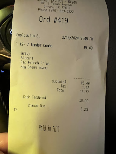 Read moreThe chicken was fresh,hot,& NOT AT ALL greasy. Hardly any wait time. The manager was firm,respectful & patient with the young staff, a few of them working for the first time. I can't tell you how refreshing it was to see and experience excellent managing skills coupled with bright & eager young men ready & willing to start the workforce with such good attitudes. I'm pretty sure it made our meal that much better! I couldn't ask for a cleaner establishment. The guys checked on is while we were eating, they were very studious and respectful. I really think it was the most delightful fast food experience we've ever had. (& everything else that we ordered was great!) The address is: 12875 FM 2154 Rd.,College Station, Tx. Thanks guys! Joel...