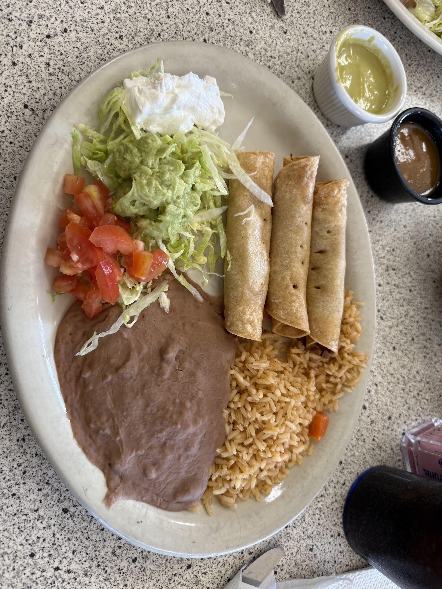 Wife ordered (a special order) a barbacoa chille releno, with rice and refried beans. Daughter ordered a beef taco plate. I ordered 3 ground beef enchilladas with rice and whole beans.