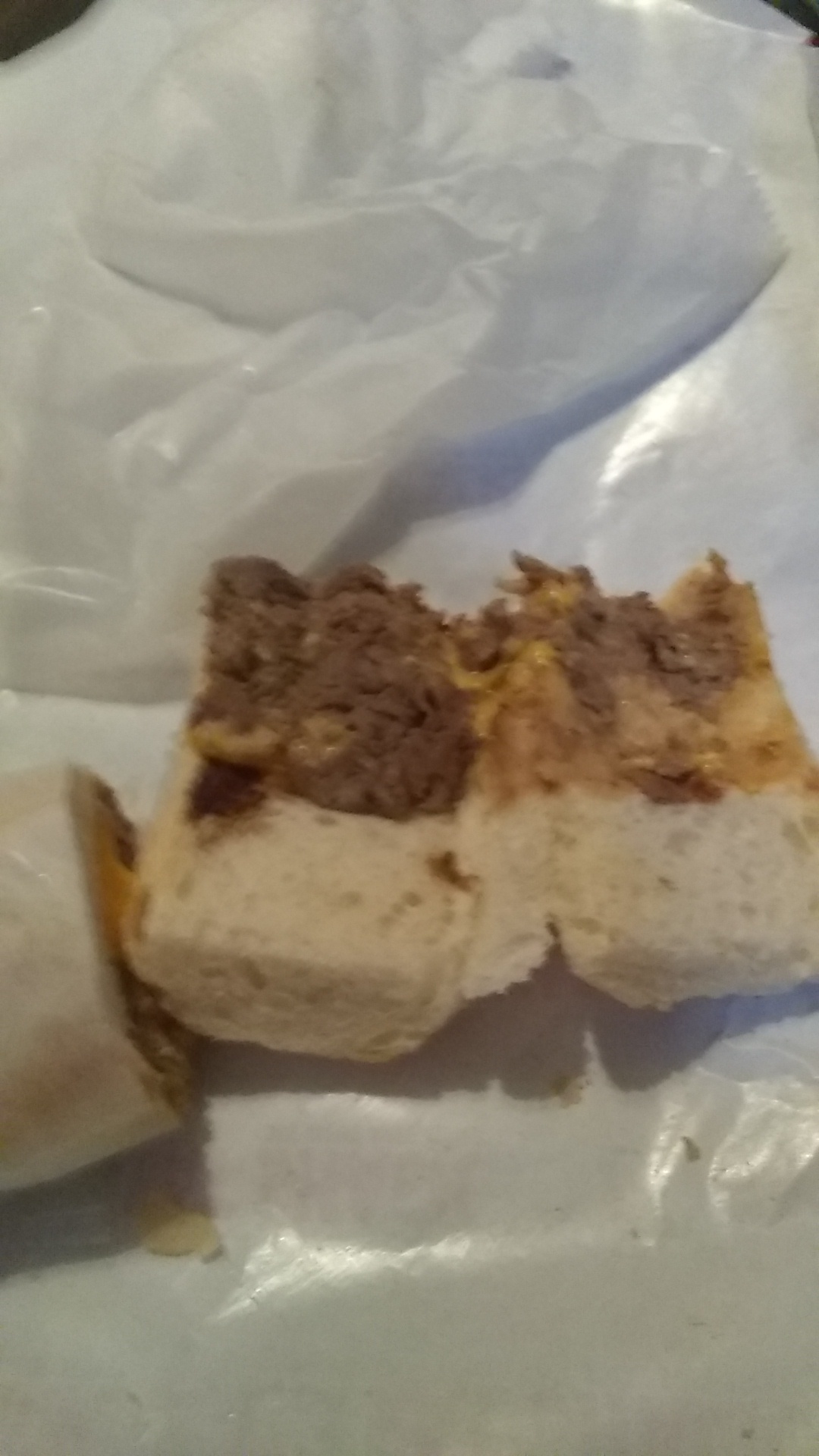 The Cheese Steak: It came out rolled in a hoagie style bun, wrapped tightly in paper, and cut into two pieces. Each piece was a little longer than I had imagined, but was rolled pretty thinly and I thought deserved a little more filling or even a wider piece of bread. The bread was truly unique. It was thin, very soft and subtle, and somewhat creamy at the same time. There was bakerās yeast on the bread adding a little extra flavor, but it seemed like it was missing something.. perhaps a little toasting or flaky edge. The filling had a decent flavor with plenty of peppers and onions and a yellow cheddar blend was mixed well throughout. However, the meat seemed to be lacking in quantity and flavor. A little more seasoning would have been great, and the sandwich itself was only slightly thicker than a hotdog. Overall, the sandwich was very average.