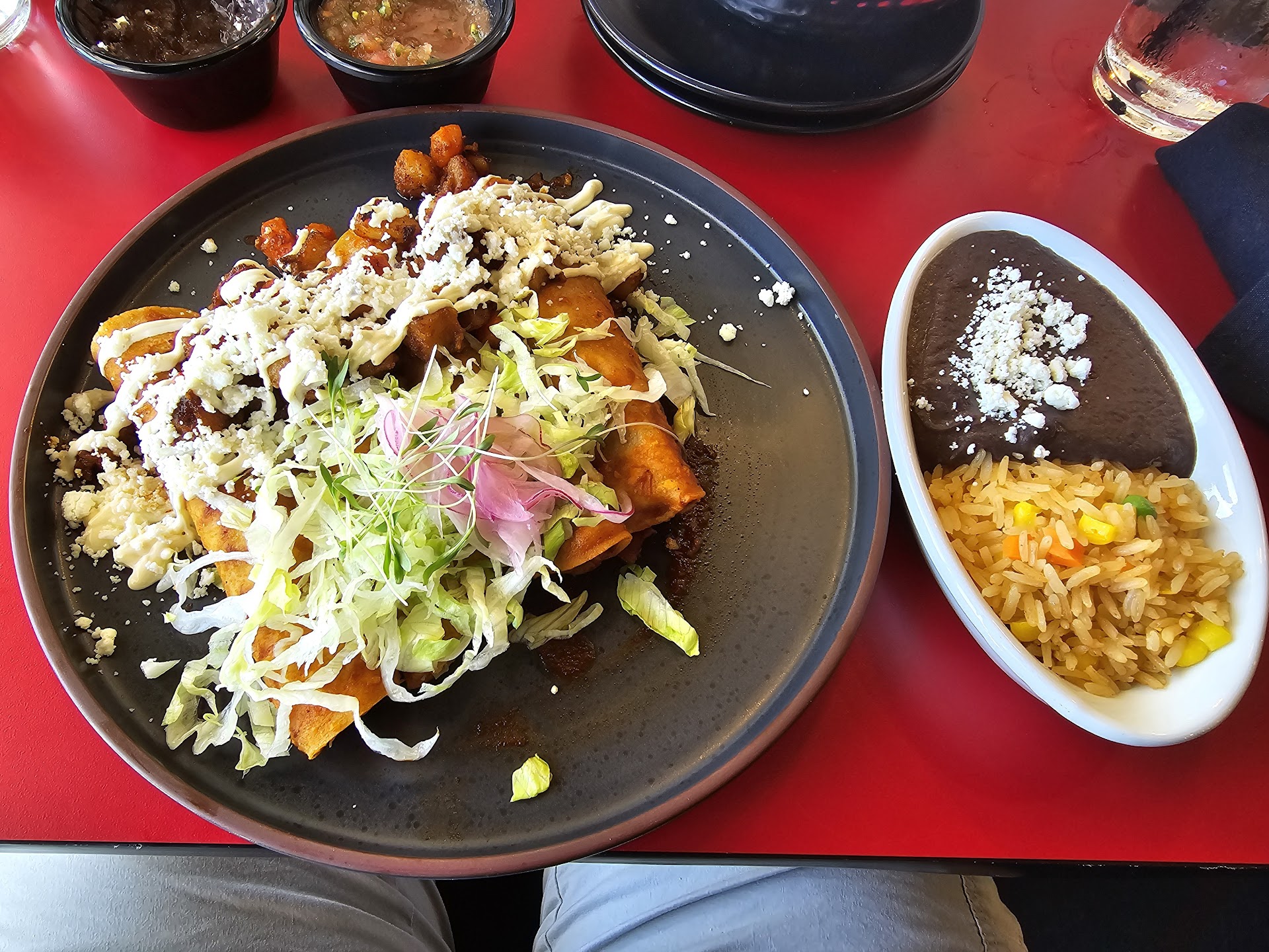 We were served house made tortilla chips with a tomatillo salsa, red salsa and a freaking phenomenal black bean dip. I ordered the Enchiladas Mexicana, which are chicken enchiladas in a guaijillo sauce with chorizo fried potatoes, Spanish rice and more of those delicious refried black beans. Amazing dish made with quality ingredients and almost too pretty to eat. My wife had the Tostadas de tinga, the shredded chicken is sautéed in a spicy chipotle sauce served on house made tortilla shells. She loved her dish as well and she didn't find it too spicy. The jalapeno green sauce that came on the side was too much heat for her but was great on my enchiladas.