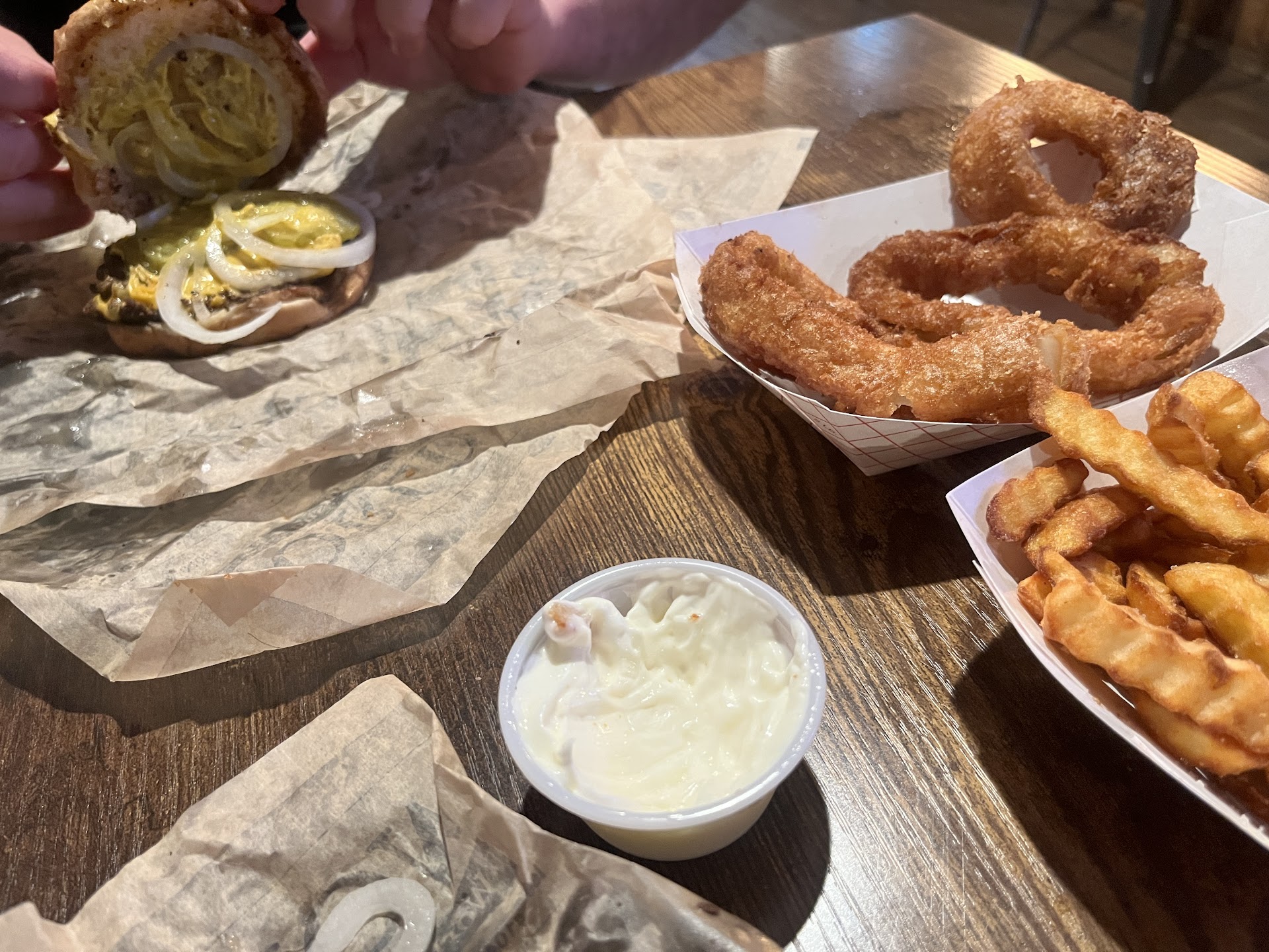 We asked for the burgers rare, something new for them, and they were about as rare as possible for a small patty - great job. I found the exterior of the burger lacked texture, it was all a bit mushy, this may be because it’s so hard to get the center a medium/medium rare on small burgers. Adding an onion ring to the patty partly corrected the texture, but would work better if it they weren’t breaded. Bun was great - didn’t break apart, grilled and buttery. Mustard good, onions great, found the pickles too thick and it made a strange pickle to meat ratio in most bites. I think the burgers could be a little more seasoned, but the cheese was really good. There is no point getting anything less than the double, this is a 2oz per patty burger.