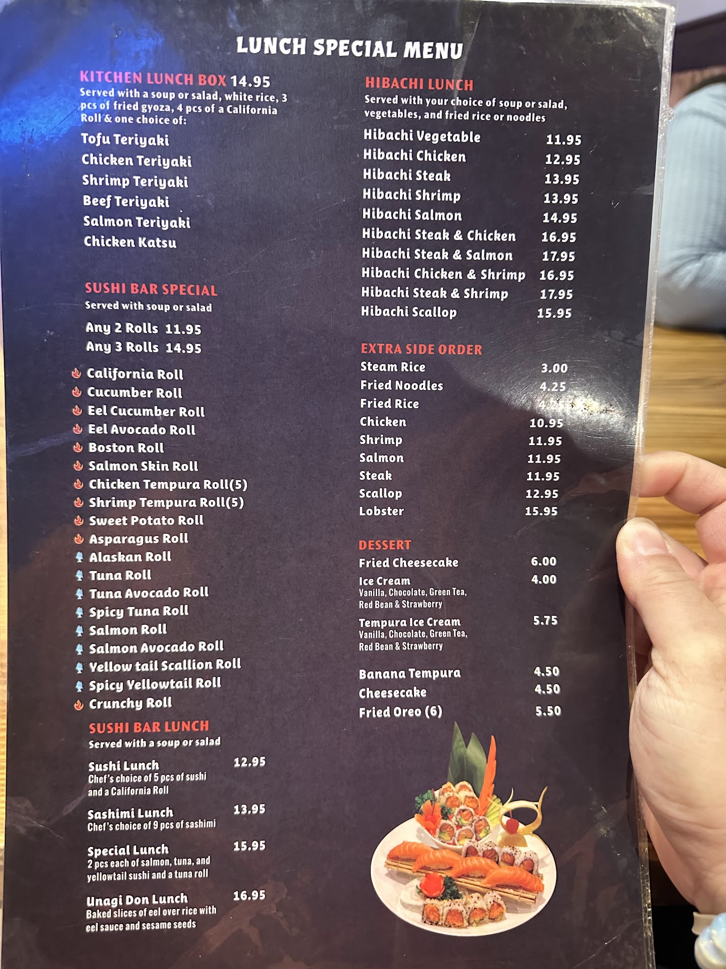 Read moreWent shopping in town. 7/10/2025 Have never been here. Usually lunch is until 3 p.m. got there at 2:35. It ended at 2:30. We were given the dinner menu. To me, that is early. But whatever, no lunch o.k. nothing we can do about that. Husband & and I can't do any damage to a buffet. The dinner buffet is $34.95. That is hefty. Lunch would've been $21.95. So we didn't get the buffet. Ordered a shaggy dog roll, I got the hibachi salmon $21.95, and he ordered the hibachi chicken. Both came with a salad & soup. Plate also has veggies & fried or steamed rice. We got the fried rice. This is a coke restaurant, so that was a plus. She took our order & the soup & salad came out maybe 2 minutes before the food. That is too fast. Didn't have time to eat the salad or soup. I can't stand cold food, so I started on my main plate. Salmon was good, too much sauce, but I just scraped it off. Vegetables had too much sauce, but they weren't soggy. Now that fried rice...was the worst I have ever had. I don't know how you get fried rice wrong. It was brown & shiny with all the sauces they put. Way too much. It was salty & there was hardly any egg or vegetables in it. I mean, Panda Express has better fried rice! We both took 1 bite & didn't eat anymore. He said his chicken was good but also too wet. The soup & salad were OK. Shaggy dog was the best item. So if you go here, stick to the đŁ sushi. The place was clean, a nice atmosphere, plenty of room, nice music going & good parking. We don't live near here, but I can say we won't be going back. Would try some other locations. Tipped good like always. It isn't the fault of the waitress for the kitchen. Gave a tip to the sushi chef, too. Total was $65.87 before tip - too much for lunch (I know dinner menu, but that was...