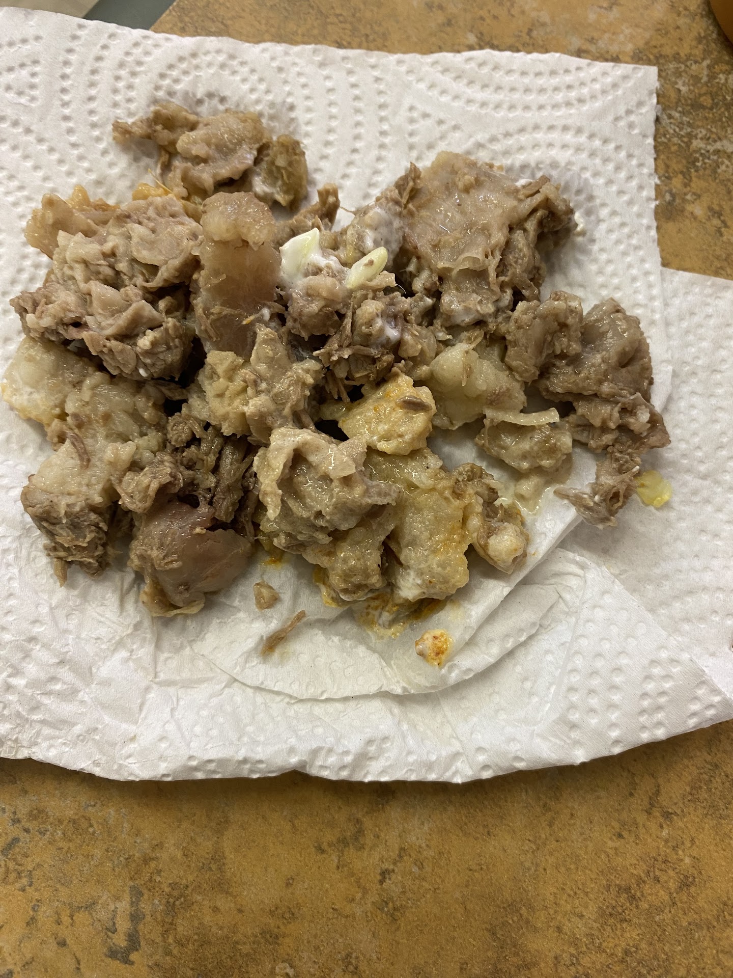 I ordered the nachos and they looked soooooo good when the young man brought them out to me. I dig in and take my first bite and was so grossed out, the meat was ALL fat. So I continue eating but now I’m picking and examining my food before it goes in my mouth because biting into fat or grizzle is the most disgusting thing! I got barely any actual meat on my nachos, no joke. Zoom in on the pic of the fat I included and you’ll see it’s fat and not meat.