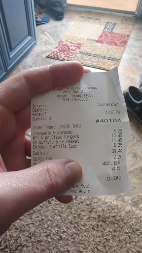 Original 1 Star Review: First I Love the Wings āN More Restaurant, I gave it a 5 Star Review in the past, so this does not reflect them. But I just ate at this Express one hoping for the same great experience on the way home and was sadly let down! First, when I walked in the floor was very dirty and I was already put off. Then I go to Order the 10 piece #1 and the kid tells me to stop I have to tell him my name first so he can put it in, then he canāt remember I just said 10 piece #1 and ask me to tell him again. Next I go to get my Drink and another employee is standing in front of the lids and straws, iām not sure what he was doing but I eventually had to say excuse me so I could get to them while standing there holding my drink. Then I go to my table when I realize my table has NO Napkins and there were none at Drink station so I have to walk back up ( with my cane in hand) to ask behind the counter for Napkins. Then some guy brings my food out and walks away and iām getting ready to eat, when I realize I only have 9 Wings. So I have to now let them know they shorted me. So some guy, I guess the Manager comes out and says āSorry, Iāll tell my guy to count better, here is a extra Wing.ā Seriously a Extra Wing! What a way to take care of a customer who has got nothing but bad service so far this whole dining experience.