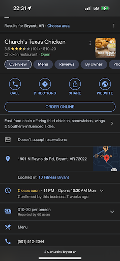 Forgot to take photos of the food tonight but the flavor was excellent. Its has been years since we had Church's so it was nice to see that the food is still pretty great. We were avid fans of Church's before we moved to Arkansas from Florida so, needless to say, we were pretty excited when we heard they were putting one in locally.