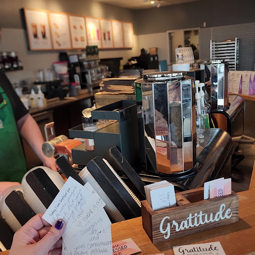 Secondly, the atmosphere and attitude of the batistas working today was exceptional. Everyone behind the counter was smiley and kind. Then, I found the little gem of this spot! They have a cute little gratitude box! It was right on the counter and easily accessible to the customers and the employees. I looked through some of the blank ones and some that were filled out. As I was looking, one of the baristas explained the idea to me. She said when they are having a challenging or rough day, the employee can grab a card or 2 and get a little lift. Some of the notes were from the employees to each other. There were things like "I'm thankful for my coworkers" and "(so-and-so) picked up a shift for me", among others. There were generic ones like "I know people can suck but I'm thankful you're here", and "keep your head up". Here's my take: happy workers make happy customers make happy workplaces make happy workers, and around and around. Definitely worth a stop to fill up on...