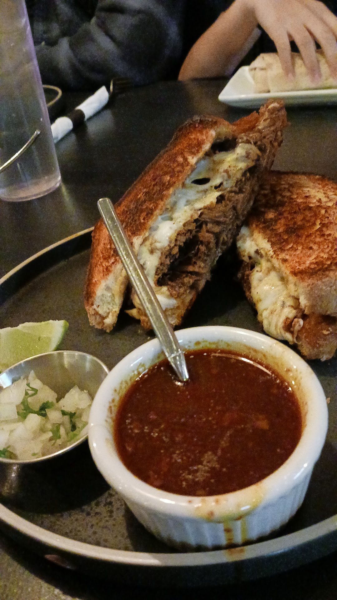 When you walk in the atmosphere is great. Everything looks nice and very well put together. The menus are nice and simple. A bit pricy but the food is worth it. Speaking of the food⌠We wanted to try a few things so we ordered chips and salsa ($3) the chips were good and fresh & the salsa was delicious. You can definitely taste the mesquite flavor. For entrees we ordered the Parrillada de carne asada ($50 - serves two) It comes with corn or flour tortillas (we got a mix of both) Rice, beans, salsa, guacamole, & chimichurri sauce. I would have appreciated two plates since it serves two, but we had to ask for those. We ordered the asada medium well, but it was very well done :( I was also looking forward to trying the rice and beans and they ran out of rice. The disappointing part was they didnât say anything about it until we asked for our rice and they said there was no more but they gave us extra beans. The beans were really good though. They had great flavor and also tasted fresh. The flour tortillas were I think better than the corn. They had a homemade taste to them. The sauces and guacamole were all tasty and delicious. The second entree we ordered and split was the Birria grilled cheese ($12) with fries (an extra $3) the fries I had to send back because they were really undercooked and raw inside, but when they came back out they were good! Nice and crispy on the outside and soft on the inside. The birria grilled cheese itself was delicious and perfect as is! The bread was crispy, the cheese was melty, & the birria was tender. A perfect combination! For drinks we ordered a Coke de botella and a water.