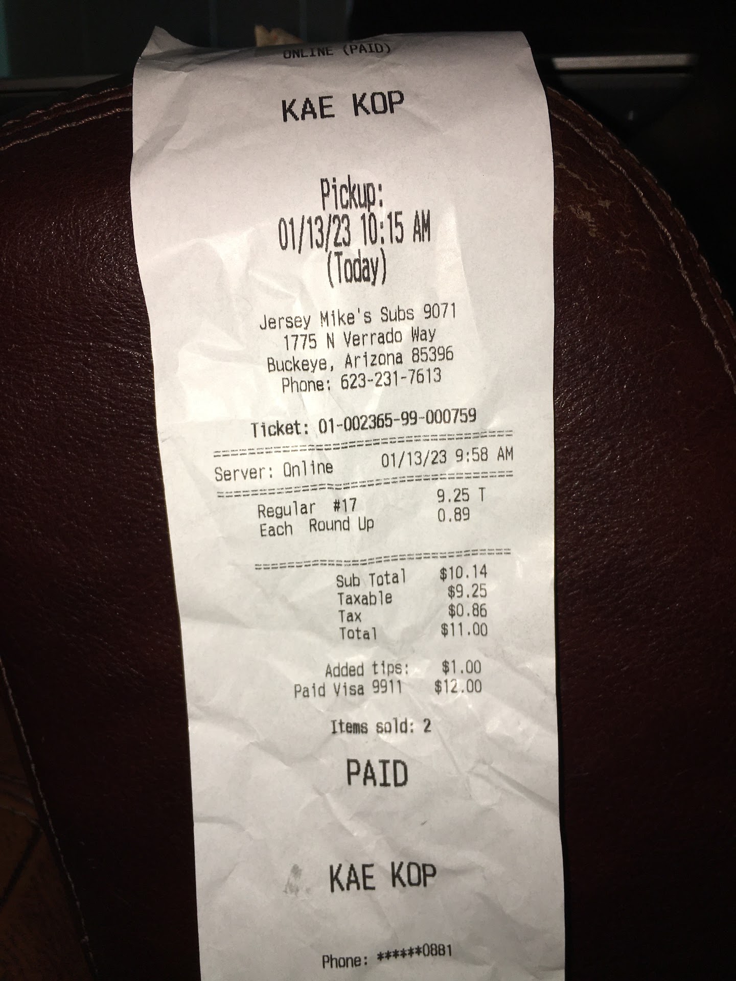 There was a problem with my coupon, which was my fault. It was buy one get one free. I ordered two large sandwiches, not realizing a large will make 4 meals! The coupon was for regular size. Oops. The cashier was nice and rang one of the larges as two regulars, which allowed her to give me one free. But I was in sticker shock when the two sandwiches and a cookie was $33! I asked to see the receipt because I thought she forgot the coupon. The receipt doesn't really show the subtraction, so it's confusing. She had to explain it to me. Anyway, I'm still in shock about how much I paid, but I do appreciate her giving me some money off.