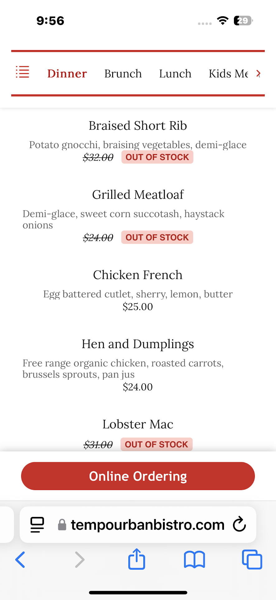 We received the menus and ordered a drink. At 7:22pm we began to order food but to our surprise, the appetizer of oysters were out of stock and the 2 entrees we desired were out of stock. The dishes we could not get were the 2 reasons we came to this restaurant. In all, 2 of the 3 Oyster, Short ribs, Meatloaf and Cheesecake were OUT OF STOCK.