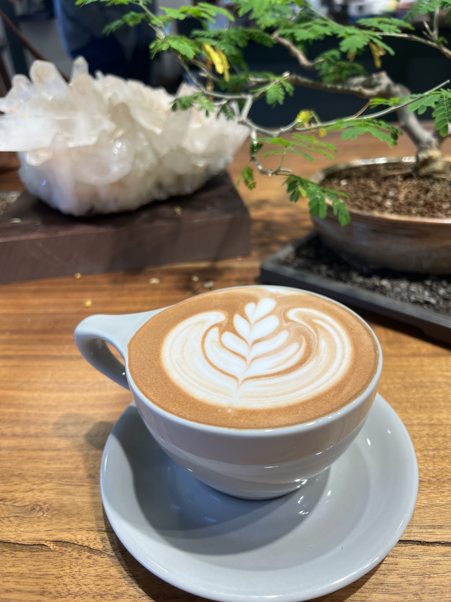 Read moreThis is the cutest little coffee shop! I stumbled upon this place after a doctor's appt and was so happily surprised. The place is small but so cozy and welcoming, with a cool mix of modern and natural decor with crystals and bonsai trees all over. I got a lavender latte and one of their homemade belgian waffles (cinnamon roll flavor) and sat at the beautiful wooden table for awhile. I found out the table was made by the owner and the craftsmanship is insane, and the coffee and waffle were absolutely delicious. It's a little more pricey than going to a chain, but I anticipate that with smaller shops, and I felt it was worth the price. I went back a few days later because I was craving the coffee and got the banana sesame waffle because it was the staff's favorite and it was sooooo good! You should totally check...