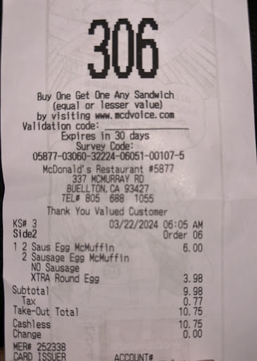 Read moreThis is the most horrible McDonald's that I've experienced by far! we went through the drive-thru we just came from Chumash Casino and we're a bit hungry wanted to get some chicken nuggets and some fries we went through the drive-thru the lady asked us to park and they would bring our food out to us it was already over 10 minutes we were waiting and nobody ever came out when we went in to find out where our order was they said they hadn't got a clue and they wanted a copy of the receipt because they lost our order I have never even been to a restaurant that actually lost a customer order like that for a drive-thru when we finally got our food the fries tasted like they were sitting there for hours soft Beyond eating the chicken nuggets were so dried out and disgusting they gave us two extra apple pies for our inconvenience that was ridiculous ! I was reading other reviews it looks like this McDonald's has a bad reputation, managers don't care and it seems not even does their staff they don't seem to b trained do not come to this McDonald's horrible...