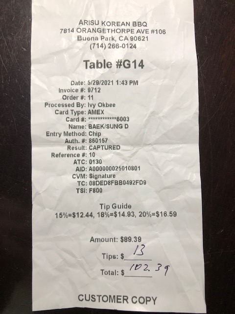 Read moreWe came in 2 hours before closing, and we saw people get turned around a hour and half to a hour before closing due to “last call being ended”. The whole meal we felt very rushed. Without being told last call ended we wanted to order noodles a hour and half before they’re closing time. We were informed that they would not be able to take our noodle order because “it takes too long to clean their machine”. When we asked about their last call, they server arrogantly told us that “all bbq restaurants have a hour last call”. However all the other bbq restaurants I’ve been to last call is usually 25-30 minutes before closing and they usually inform us before the kitchen closes. If this is the case we recommend the closing time to be updated to 9pm instead of 10pm. The meat quality can be found in any other restaurant and there was nothing particularly special about this place to hold us back: 20 minutes into our meal they handed us the check. While eating we slipped our card in and they had immediately taken it back, nothing wrong about this however when they returned our card they kept coming back to our table for our tip/signature. We felt so rushed and uncomfortable we ended up togo-ing the rest of our food. We do...