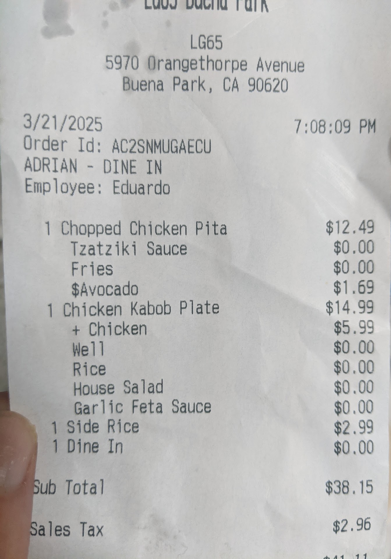Read moreI'm sorry but now that I am home, I have to edit my review. Tonight was the third time that I have visited this eatery this week, and just visiting this eatery period, as I have never been here before. I can say I am disappointed in my meal this evening. I ordered food for my family and myself. Everything is fine just as it has been the other two visits, with the exception of my meal. Tonight, I ordered a chicken pita with avocado and my side choice is fries. The fries are not good at all. I regret getting them, I should have chosen rice or a salad. To make matters worse, I ordered my pita with avocado, as the option was given to me by the person taking my order, and I paid for avocado, but there is no avocado in my pita. So I paid for something that I was not given. So my meal is not the best, as half of it is not good, the fries, and I'm missing my avocado. Hopefully, the chicken pita itself is good. And the person who took my order put that my order was for dine in but it was...