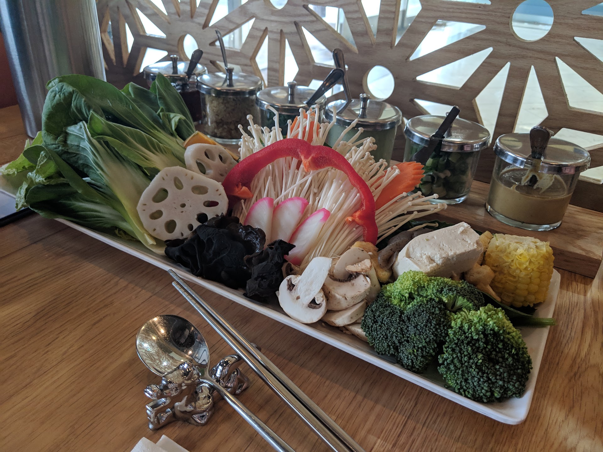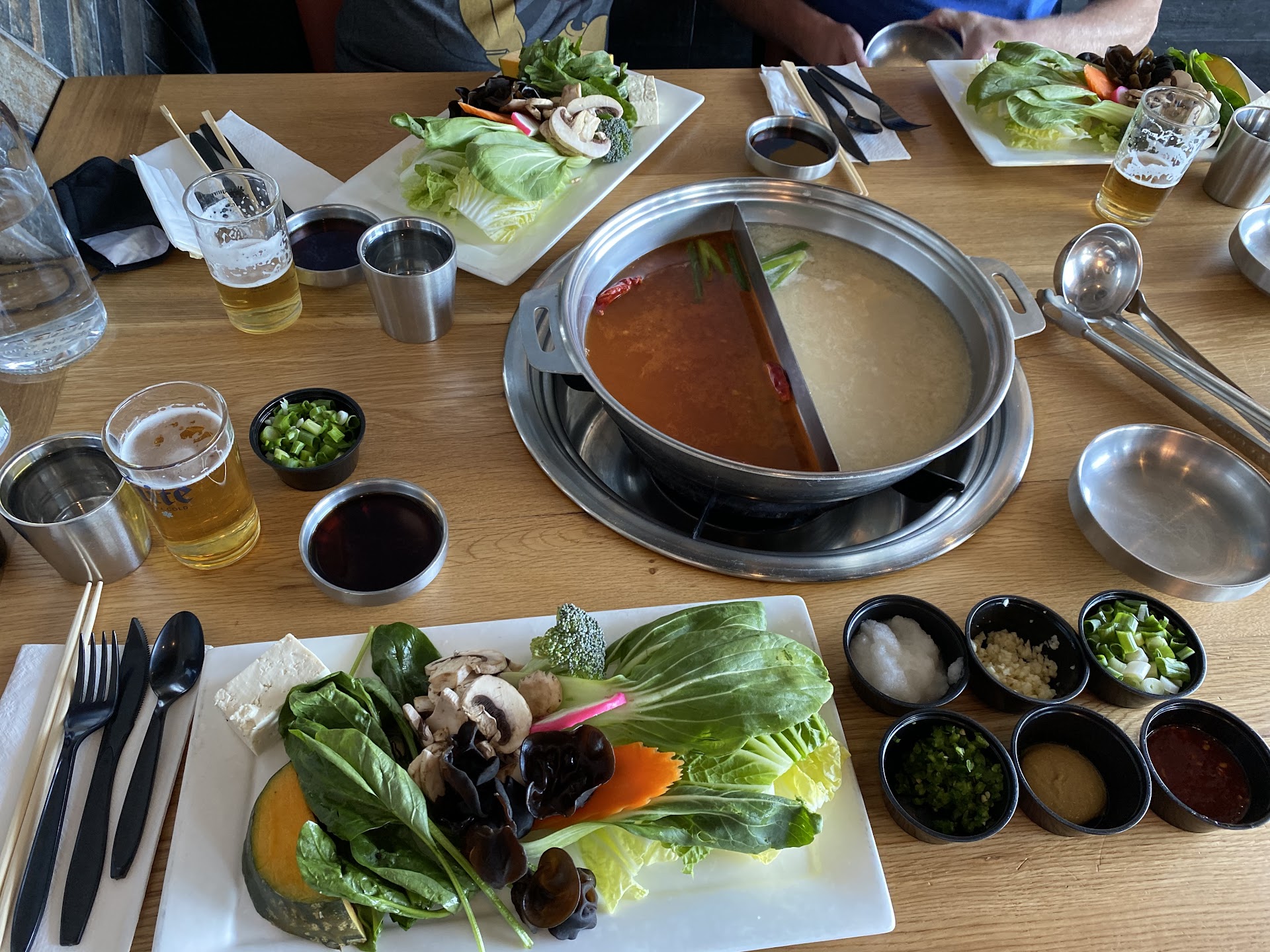 We arrived at opening, so the bar wasn't fully stocked with their hot items, but the veggies and seafood options were pretty full. I grabbed some fish cakes, crab, bok choy, Napa cabbage and some kimchi. For sauce, I mixed some ponzu, grated radish, sambal and some water (mul) kimchi.