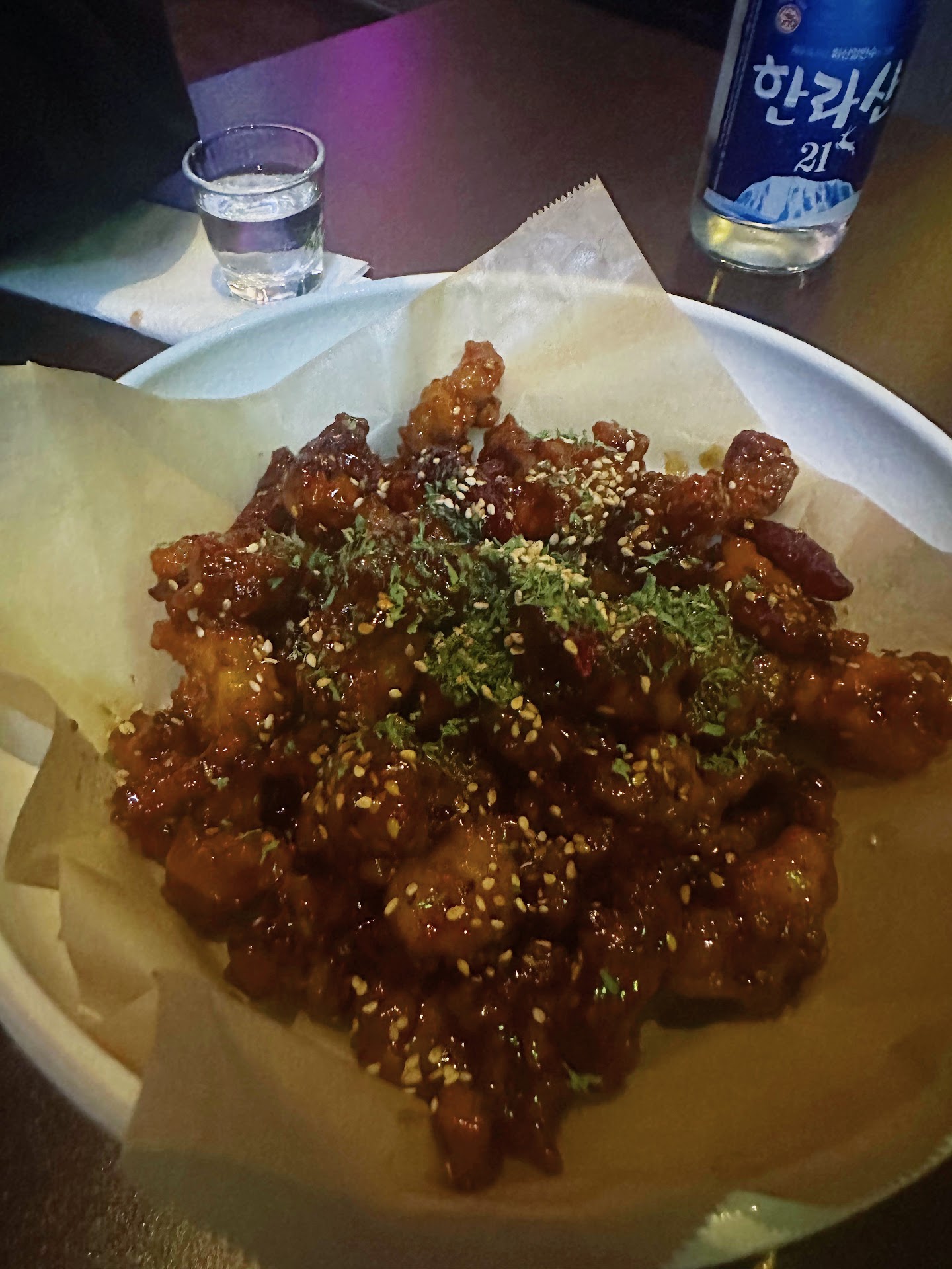 The food here is so delicious perfect for a night out of drinking and good food. We got the sweet spicy chicken and the sauce is delectable. Not pictured but the black sesame dressing on the salad is to die for. Even the complimentary nachos has a cheese sauce like i've never experienced. The servers here are also very delightful. We were able to speak to the ahjumma that runs the kitchen and she was so sweet and kind. Ambiance is very fun with led lights and great music. Plenty of seating including a beautiful outdoor patio. Being from LA I was definitely not expecting a parking lot but there was a spacious parking lot which was a great surprise. Definitely will be back any...