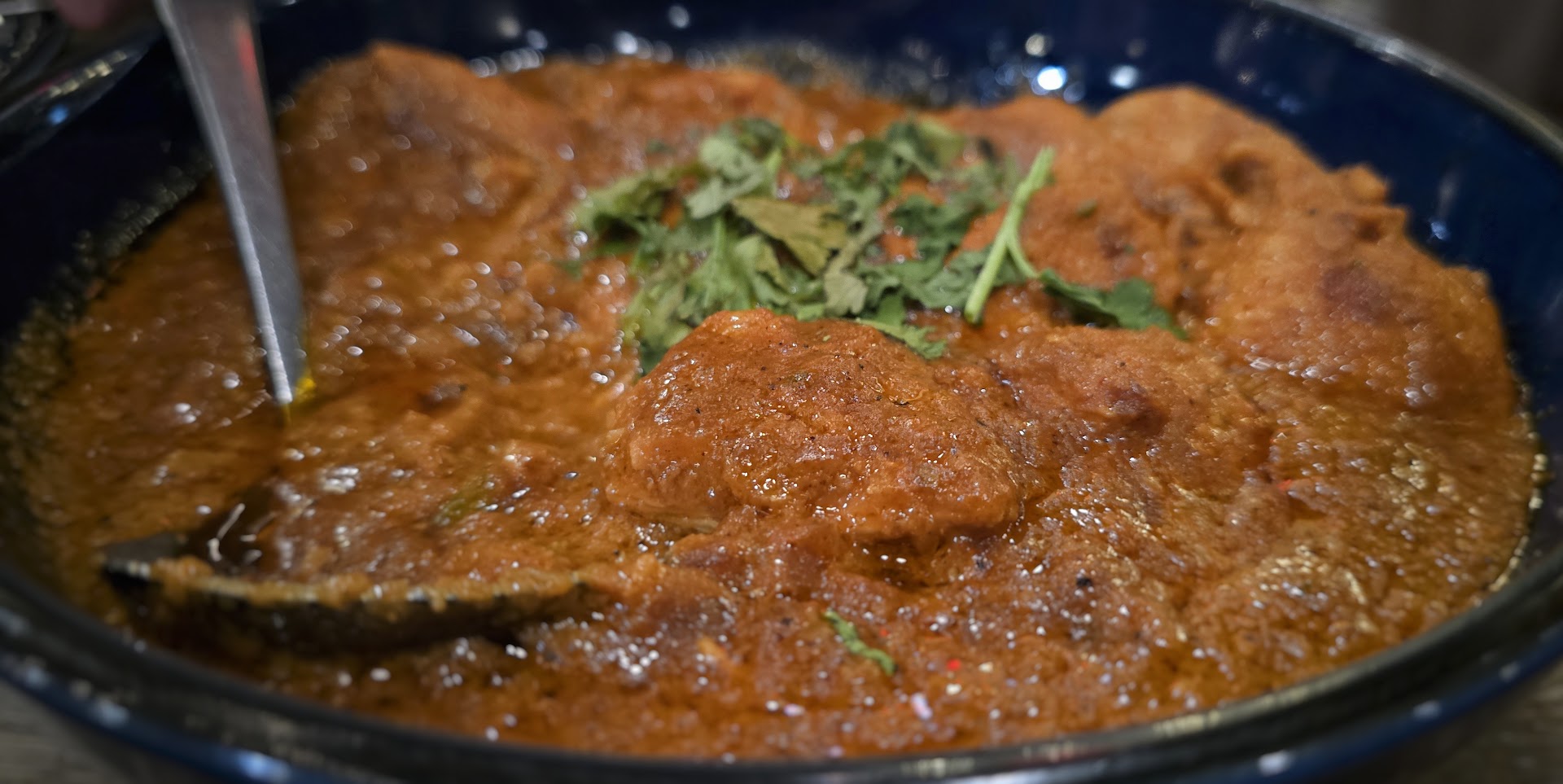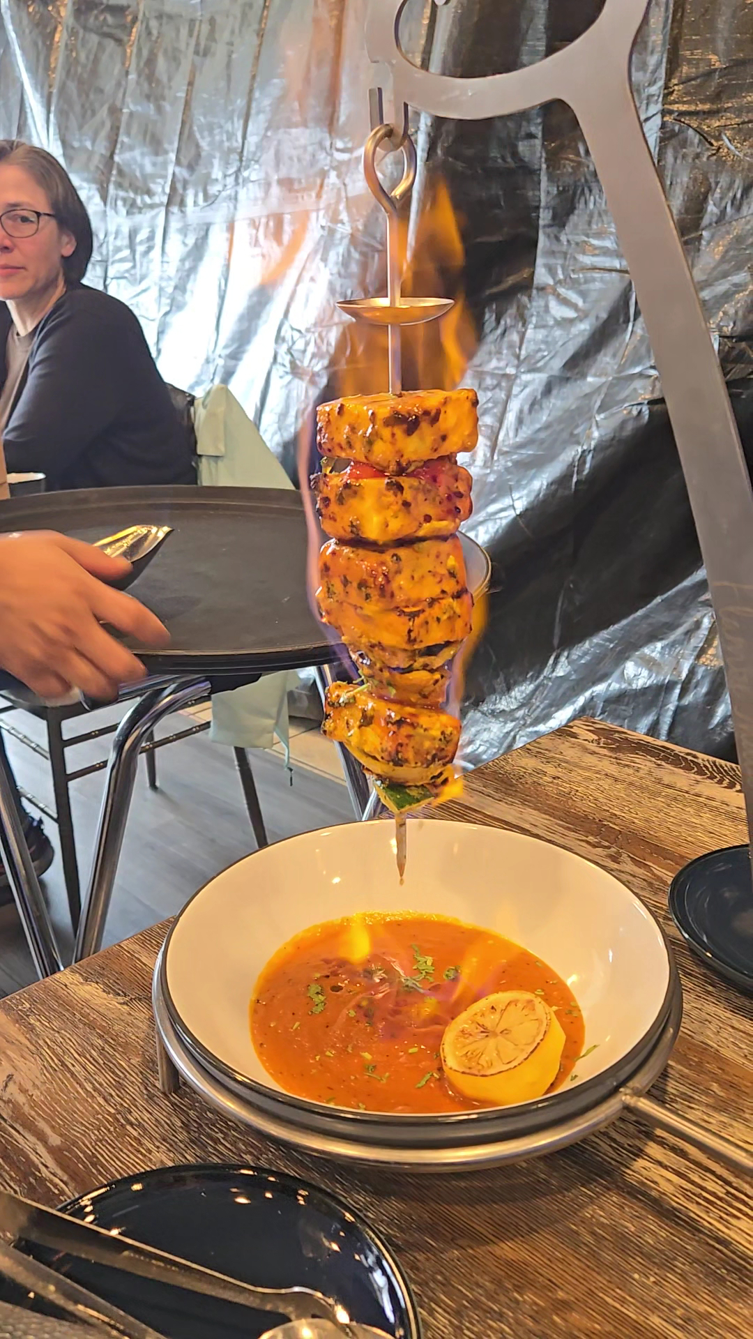 The Food Wow. It's clearly well thought out. Other places I've been to feel a bit lower scale, sloppy and greasy however Flambe India comes across as higher tier and fresh. Food is craveable. The naan was huge with the perfect amount of fluffy softness and crisp. Honestly a show stopper. The raita, which I usually skip, was impeccably delicious. Tamarind and chutney seemed standard but good. You must order rice as a side dish and there are several profile options. I recommend the cumin rice. Lovely basmati and perfectly seasoned. Cocktails were expertly prepared and did not start with bottom shelf brands.