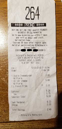 Read moreONLY THE FACTS: Walked into McDonald's to place an order "to go" on 10/03/19 at 7:18pm. Drive thru happened to be busy (but that's okay.... wasn't in a hurry.... I didn't mind waiting). Lupe took my order: One Double Cheeseburger (no pickle), One Double Quarter Pounder w/Cheese (no pickle) and One Large French Fries. All this was "ala carte" (per item w/no drinks). Total Due on the register was $11.74. I gave Lupe $12 cash. (My expected cash back would be .26 cents). When Lupe pressed the "Total" key, it gave an error and the register displayed $9.03. Lupe had entered the order three more times but the final total bill each time still showed $9.03 on the register display. Lupe gave up trying to figure it out and gave me exactly .25 cents (a quarter) back as change.... she took the receipt, crumpled it up into a little ball and tossed aside between the two cash registers. While Lupe left the register to assemble my order, I was curious about the "ERROR". I picked up the crumpled receipt and unraveled it. Looking at the receipt, it shows PROMO at the top. (I'll post the receipt #264 with this review so that you guys can see) According to the receipt, I was not being charged for the Large Fries and on the bottom of the receipt shows "Total Savings" = $2.49.