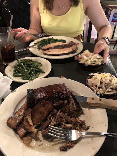 First time here. We wanted to like this place. The inside decor was very nice. Floors were dirty. There were only 3 tables seated in the whole restaurant at 6:00 on a Saturday night and the server was polite but not super attentive. We all sat with empty drink glasses for 15 minutes. Food took somewhere around 45 to 50 minutes to come out. The meats we were served tasted not fresh like they were sitting for a long time or were reheated. Either our order sat in the back for a long time or the food was sitting out and not held to proper holding temperature. BBQ sauce no one liked, tasted like it was half BBQ and half tomato paste. Mac and cheese was homemade and was good. Brisket was dark brown, old, unseasoned, lean, tasteless. The peel to eat shrimp had the most flavor out of all the food. Served swimming on a hot plate of liquid with seasoning sunk to the bottom. One other in our party got the pulled pork and said he liked it but not the sauce. We might give it another shot, but not what we hoped for. They charge a fee to customers to use cards here. The pricing was appropriate for the portions and the place has potential, just needs more attention primarily to the food and they'd probably have a better crowd and people would want...