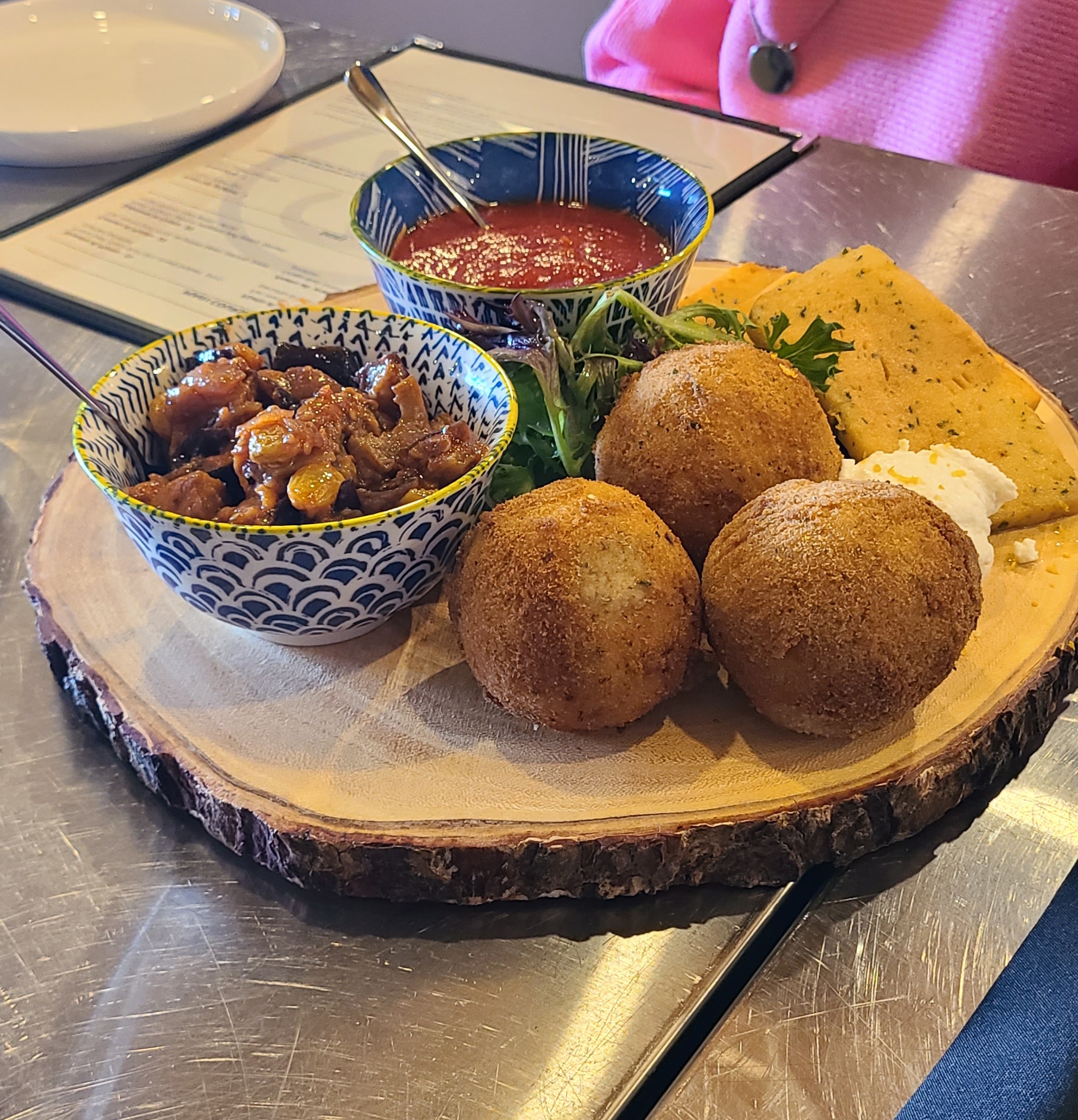 The first starter we ordered was 4 pieces of hollow fried dough with some sort of a creme sauce that was very noticably watery placed on top, and a slice of salami on each (The salami looked strikingly similar to Wegmans brand salami sticks you would purchase from the shelves near the deli). We also ordered the Arancini, which were okay. I have nothing bad to say about those.