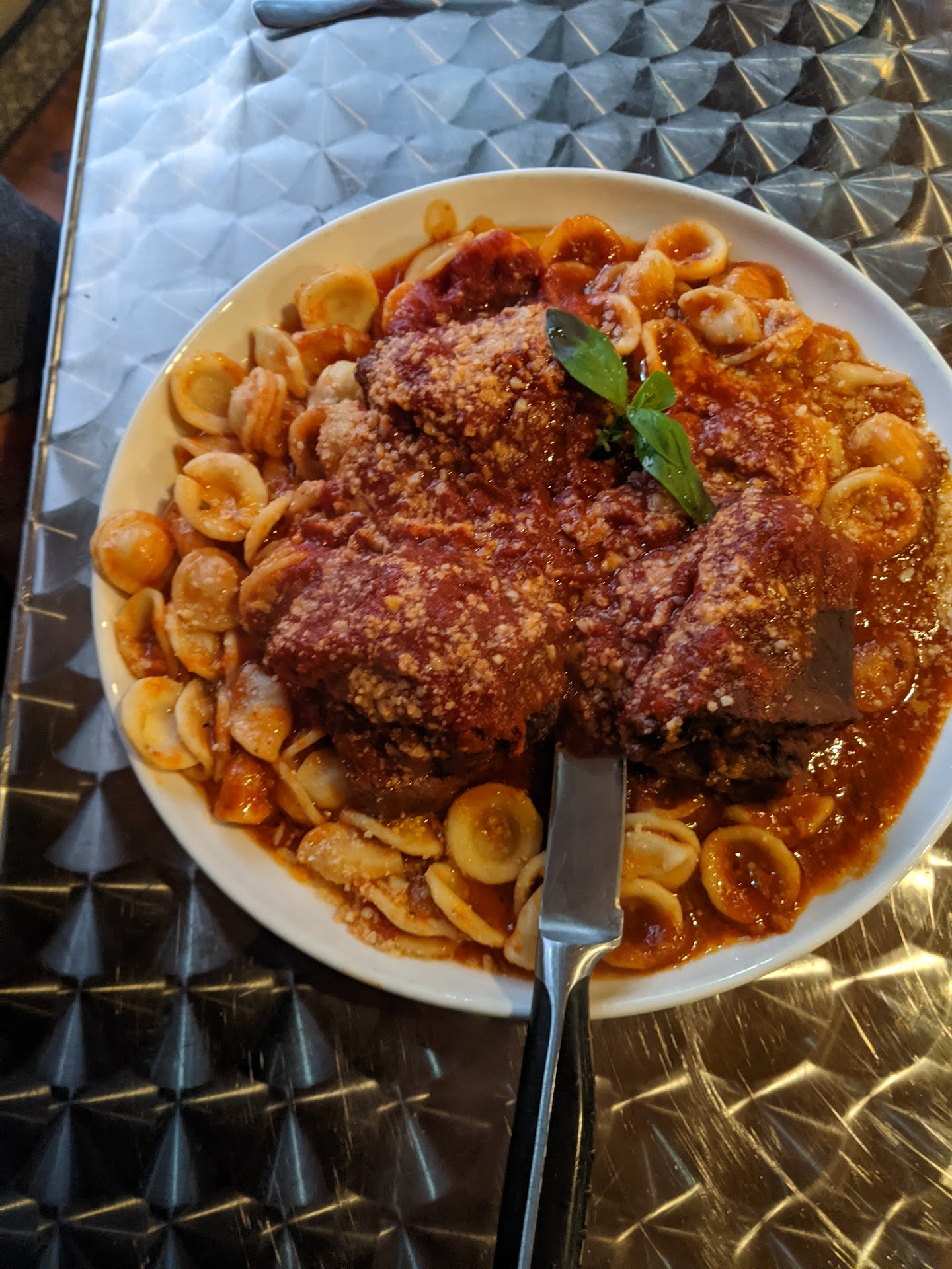 I ordered the beef braciole becasue the waitress said the cook was “famous” for that dish. The word “famous” must be self imposed because the meat was PAINFULLY dry and it didn’t appear to have anything stuffed inside of it. I picked through it to find any sign of cheese or garlic or herbs and only found pieces of the tooth pick that I bit on. The dish was served over some severely over cooked orecchiette pasta tossed in some very bland tomato sauce. This dish was TERRIBLE. (Is it too much to ask that you learn to tie the braciole and not use toothpicks? And how about learning to make pasta to order?).
