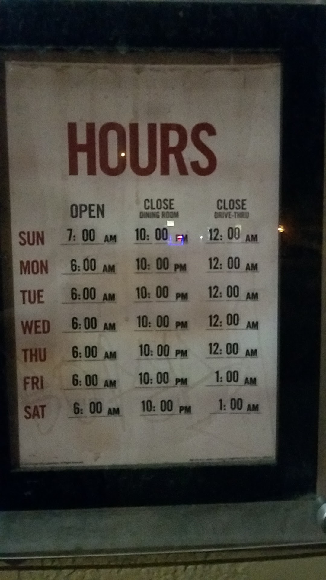 Read moreAs far as food and service goes fairly.devent for a fast food location. The fries are rarely fresh but usually still possible. Its one I'd then few places I can say has never messed up a burger order any of the times I've been there. The counter is sometimes a little slow, I'll wait at the regester for 5 minutes with no one coming to take my order. That doesn't happen often tho. The restaurant is clean, the bathrooms as well. The only problem I have ever has was one night it was 9:55 and there were people seated, eating in the restaurant, however the doors were locked. So I walked to the drive through and waited a second. The kid spoke through the drive through speaker telling me "only cars through the drive through" I know that's a lie, I've walked up to the window numerous times because they stay open an hour later than the dining room. I thanked him and left. It's fairly obvious they just susnt want ri make anymore food that night but I was still a little irritated. Needless to say I would avoid this restaurant late at night. If you want decent service only go during the day, otherwise it's a toss up on if you'll...