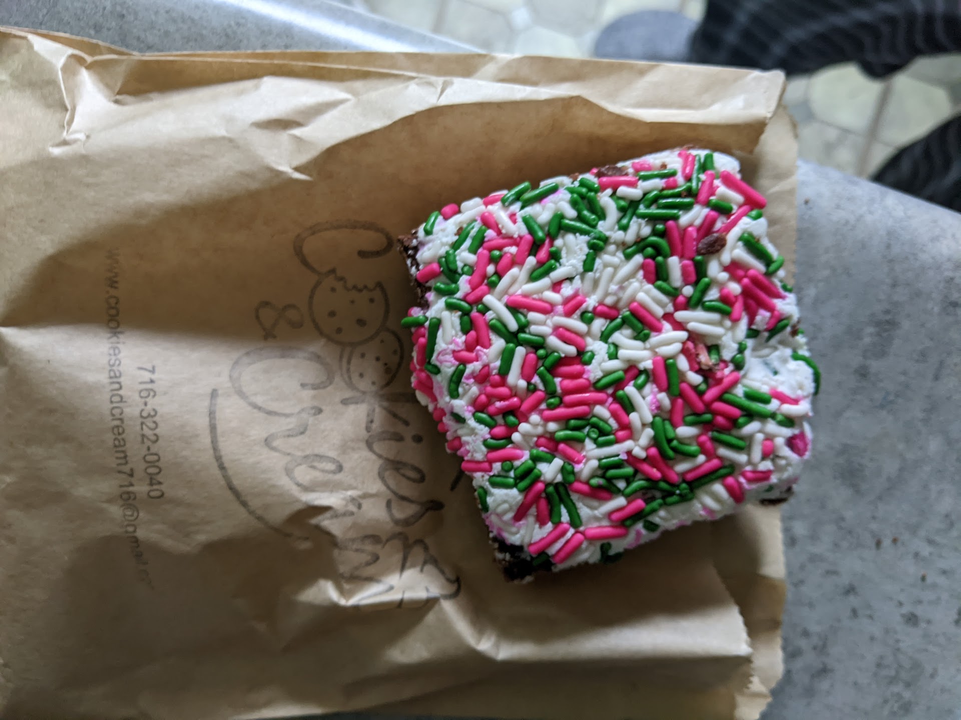 Read moreThe caramel cookie was the best and softest of them all and had a very nice rich buttery flavor.. really delicious. The brownie with buttercream frosting is my favorite, even though I never eat sprinkles, I don't mind the sprinkles on these brownies because they're soft. One time they accidentally gave me the brownie with the chocolate sprinkles and I didn't like it at all, it left an awful aftertaste. Ive had cookies in the past from here, I've tried most of the flavors and although the taste of all of them was decent, i wasn't impressed because some of them were too hard and dry but it seems like they've improved this. It's a really nice little shop, it's very clean, it smells amazing, the manager is super friendly and helpful. Lots of different cookies, ice cream cakes, ice cream Etc and they have a nice little outdoor space...