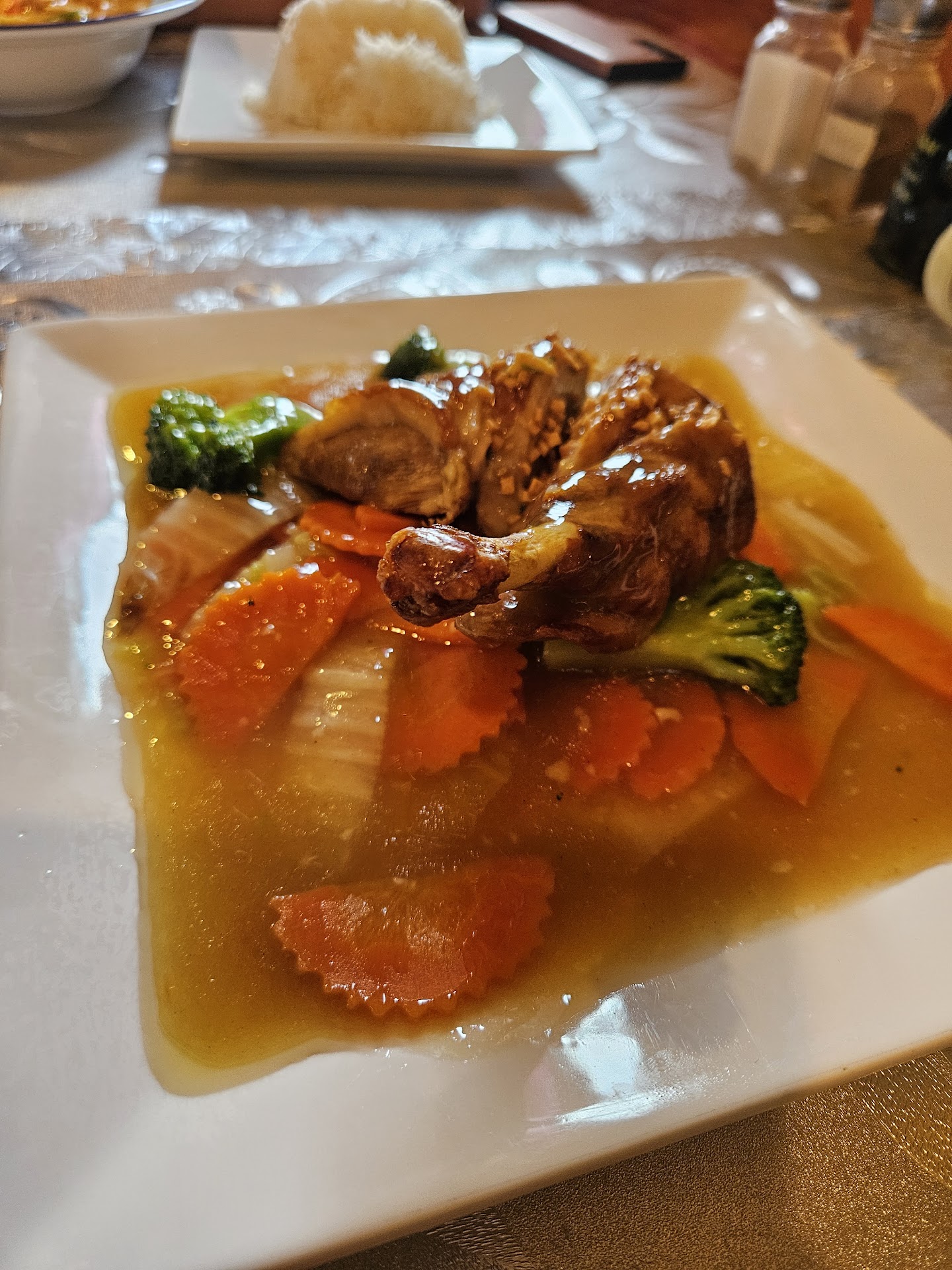We ordered panang curry, roasted duck w/ vegetables and rice, and iced thai milk tea. It took a long time for the food to come out. The iced thai milk tea was forgotten about until we were practically done with our food. At that point, I declined to receive the drink. The panang curry was unremarkable but the roasted duck was gross. The duck and vegetables were swimming in oil/fat puddle.