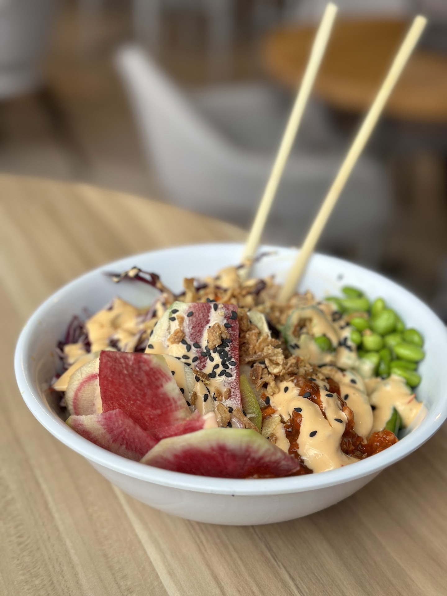 Read moreStopped in for dinner before a show at Babeville. Walking in the door, we were hit in the face with the STRONG odor of (not fresh) fish. There was one couple in front of us ordering and three employees working in the store. Only the one who waited on us acknowledged us, while the other did online orders(?). Took at least 10 min to get service. Friend had Flaming Tuna bowl as listed and was served the dregs of sauce and bits of tuna left in the container, not a full serving of protein. When he questioned it, server argued he was given a full serving, then added a few pieces of fresh cut tuna because the spicy tuna was empty. I had the Bubba bowl as listed. It was fine but the freshness of some of the fake crab used was questionable. The bowls are over sauced for sure. Not the best or even good poke poke. It was adequate (served with a side of underlying worry about food safety). Food cases were an unappealing dirty mess, water station dispenses water that tastes like machine and misery, store feels not clean, fabric seating is stained and gross, rap station was extra loud and more suited to the after-hours clean up crew. Dined in and left as quickly as possible at 6:40pm. Met a disappointed couple at the door trying to get in which was already locked. Posted sign stated the store was closing at 7 due to Bills game. That couple got lucky and went somewhere else to eat....