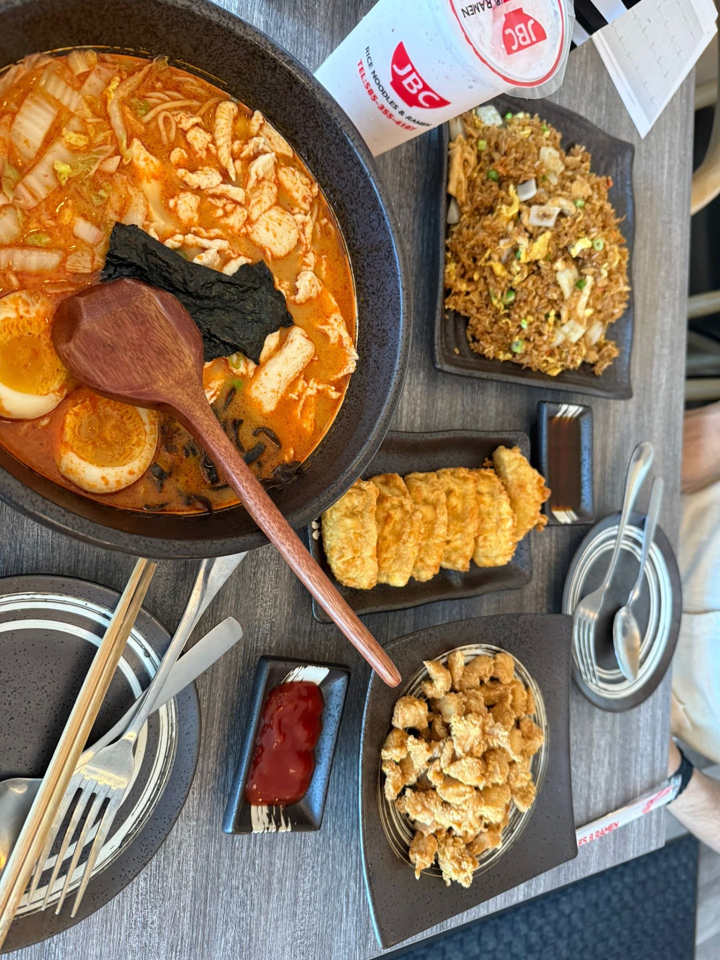 We stopped in after work for dinner. We got the vegetable spring rolls, crab rangoon, tonkatsu ramen, dry tossed rice noodles with minced pork, passion fruit bobo green tea, and mango pomelo sago tea. The appetizers were okay and very typical for an item that is available from frozen. I would like to see house made vegetable spring rolls. The Ramen had a delicious and balanced broth. The noodles were cooked perfectly with a bounce on each chew. The chashu (pork belly) was flavorful and tender. I would definitely get it again. It was also topped with ear mushrooms, nappa cabbage, scallion, nori, fish cake, and soy sauce marinated medium boiled egg. The tossed rice noodle had a kick, but it was a good spicy topped with minced pork, scallions, corn, cucumber, and soy sauce marinated medium boiled egg. Note: it is a peanut butter base sauce. The cucumber gave the dish a reprieve from the building spiciness. The was plenty of food where we decided to finish the ramen dish and take the rice noodle home for lunch tomorrow. We were plenty satisfied with the meal. We ended our dinner with Boba. The passionfruit was tart and refreshing. The mango tea was creamy and paired beautifully with the spicy rice noodle. Note: we requested no additional sugar as the fruit syrups made the drink appropriately sweet. We will definitely be returning and highly recommend for first-timers. Also, the staff was friendly, helpful, and...