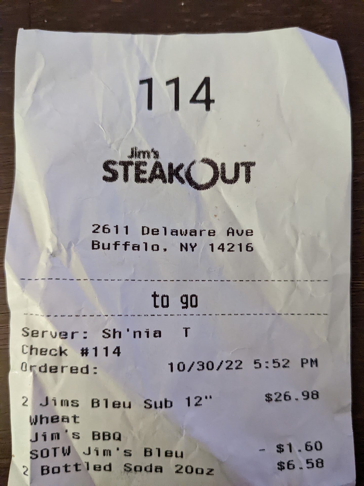 Read moreI've eaten at various Jim's locations for over 20 years. I understand the gripes over the lack of quality and consistency, even at the same location. I hadn't eaten at the Delaware site in years. We went to this Jim's (June 7, 2024) after being out near Buff State. I chose this one because it has a parking lot, unlike the tiny one at near Elmwood Jim's that everyone uses. The wait was minimal, and there were plenty of tables to accommodate everyone. I got the Jim's Hot Bleu, and it was the best one I've had in a long time. My friend got a steak and cheese sub. They, too, said it was fantastic. I attribute that to the staff. Why? Because whenever I get food that is subpar, from anywhere, I take into account the day, time, and if it's busy-which isn't an excuse for them. However, some places just have good staff that get the job done well despite staffing issues and if it's busy. Well done, Jim's Delaware staff! Btw I enjoy tipping at Jim's because they all...