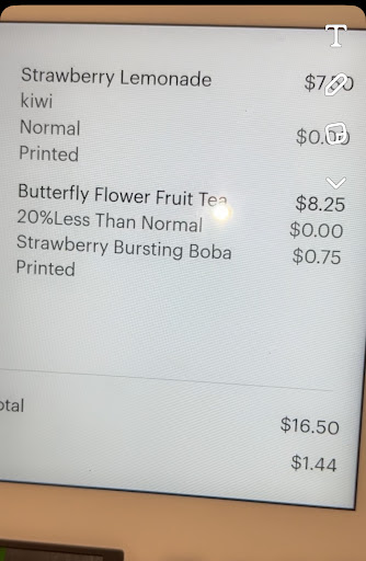 My kids got the butterfly tea with strawberry bobas. I got a strawberry kiwi lemonade. They both were very cute, sweet& refreshing &satisfying.