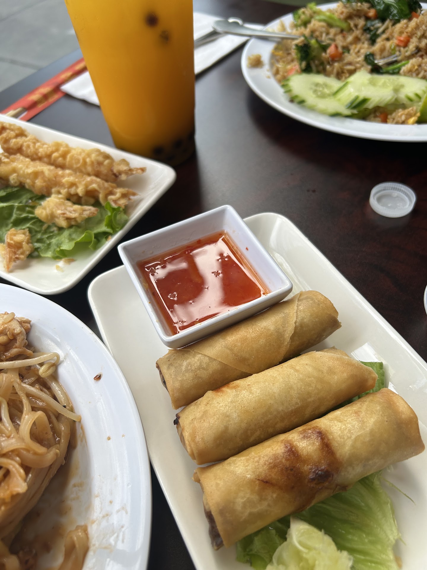 We tried the chicken spring rolls, tempura shrimp, chicken pad thai, and pineapple fried rice with tofu.