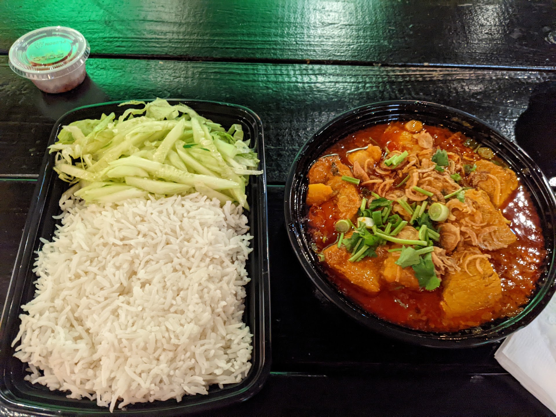 Read moreHonest review. I'm usually not a picky ester and I'm happy with what I have. Ordered the chicken curry. Tastes too salty. You can only taste salty chicken. No curry taste. The portions are generous. Lots of chicken in 1 inch cubes. No curry taste within chicken. Like eating dry chicken. My friend ordered the pad Thai. Again salty but generous portions.