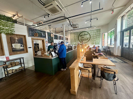 The chalkboard menu is as approachable as the space: quick caffeine when youâre on the clock, or stay-for-a-while brunch and cocktails when youâre building a morning worth remembering. The pastry case is dangerousâin that way where your eyes taste firstâand even the branded cup sleeve feels intentional, the tactile kind of detail that says somebody here cares about the little things. Thereâs a modest retail shelfâbeans, mugs, tumblersâthreaded with vines against the brick, like the space itself is quietly rooting for you.