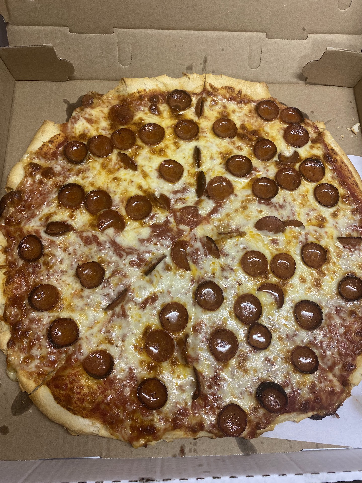 Read moreStopped by here for the first time since moving into the neighborhood. The picture does this pizza no justice. Homemade dough to make their pizza. It give the pizza the perfect crunchy crust yet it was so easy to bite into. The pepperoni used also has a nice little kick to it. As an added surprise on Tuesdays and Wednesdays, large cheese & 1 toppings are $14.95 + tax. I’ll definitely be stopping back here...