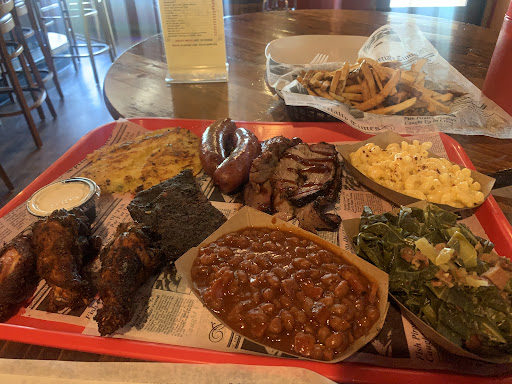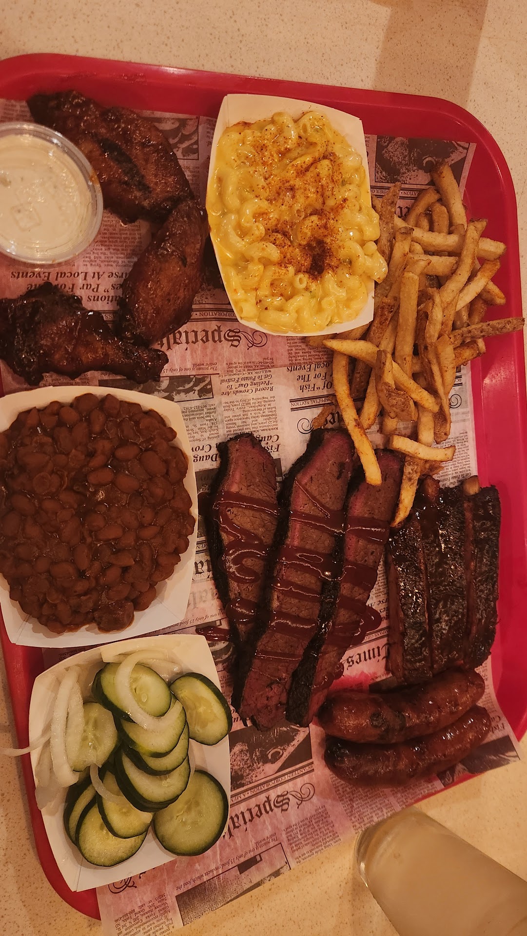 We ordered the sampler which came with brisket, smoked wings, corn cake, ribs, Mac and cheese, greens, sausage, fries, and beans. We ordered an extra side of brisket and ribs, just because we knew what was in the sampler wasn’t enough for the both of us… lol