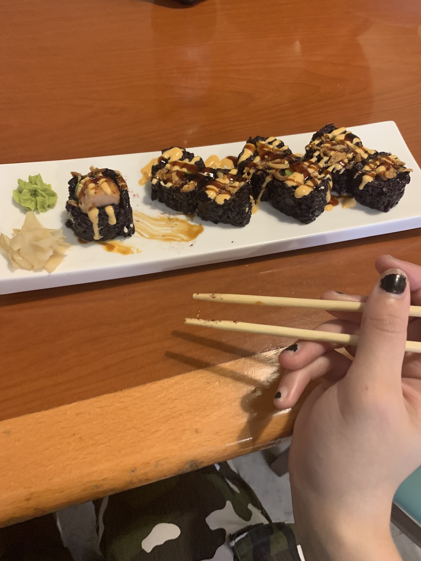 The food is consistently very good the sushi wraps are a tasty and unique item that I haven't seen offered anywhere else In the area.