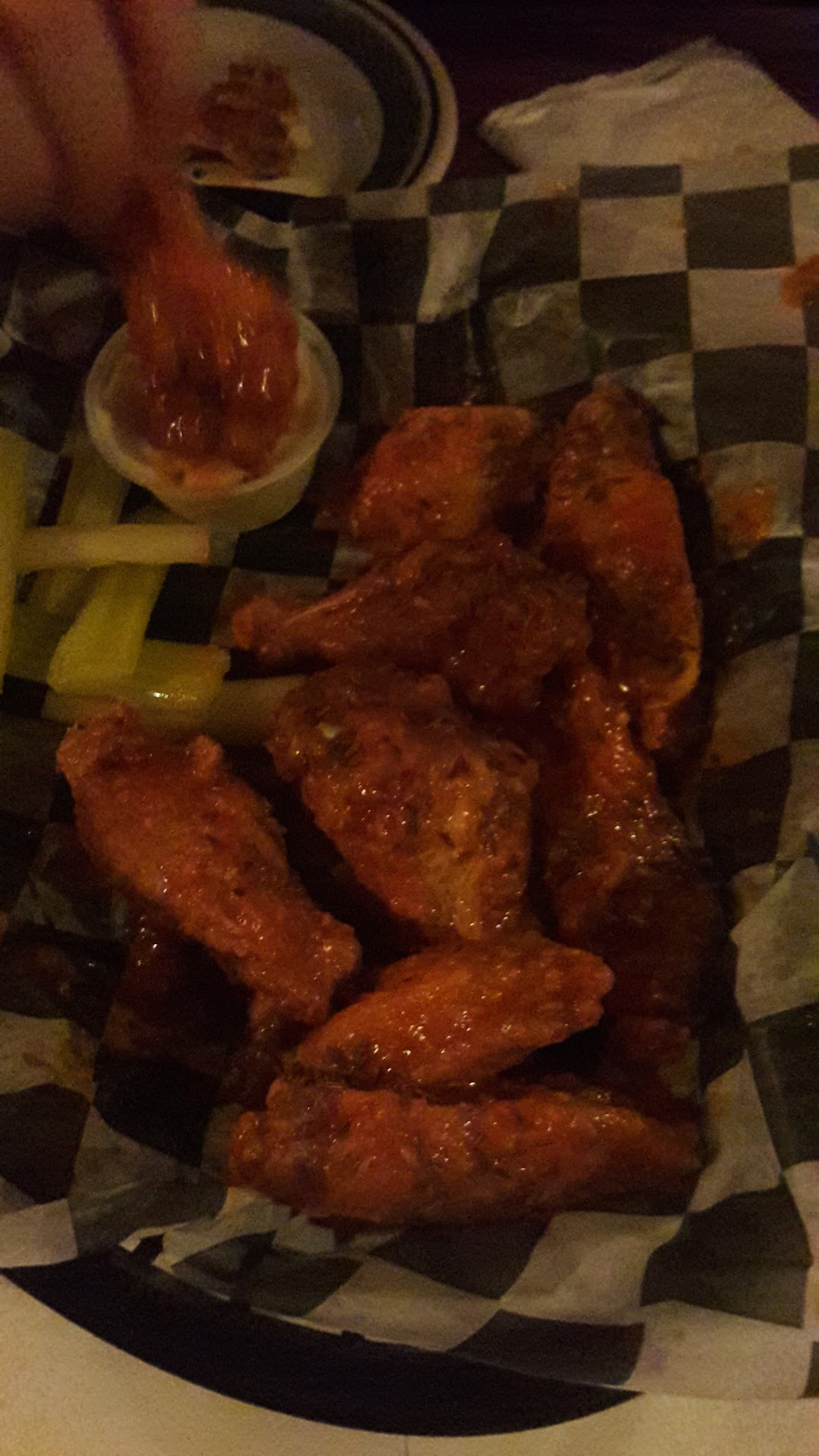 Despite being Good Friday there was only one bartender, and one hostess/waitress on shift. The appetizers came out first and were 50/50 when it came to quality. The french onion soup was heavily over-salted and had almost no broth - just a large heap of overcooked onion and cheese indicating it had been made and sitting for days being re-heated repeatedly. The wings came out hot, crispy, and tasting exactly how these out-of-town folk had been craving.