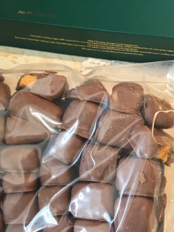 I have found that 15-20% of the box I'm buying has pieces where the honeycomb center is very chewy or has shriveled up. For the price, every piece should high quality. There are no expiration dates on the boxes and perhaps the orange type I get does not turnover as fast as other product, but I no longer what to spend the money on these when this problem is persisting.