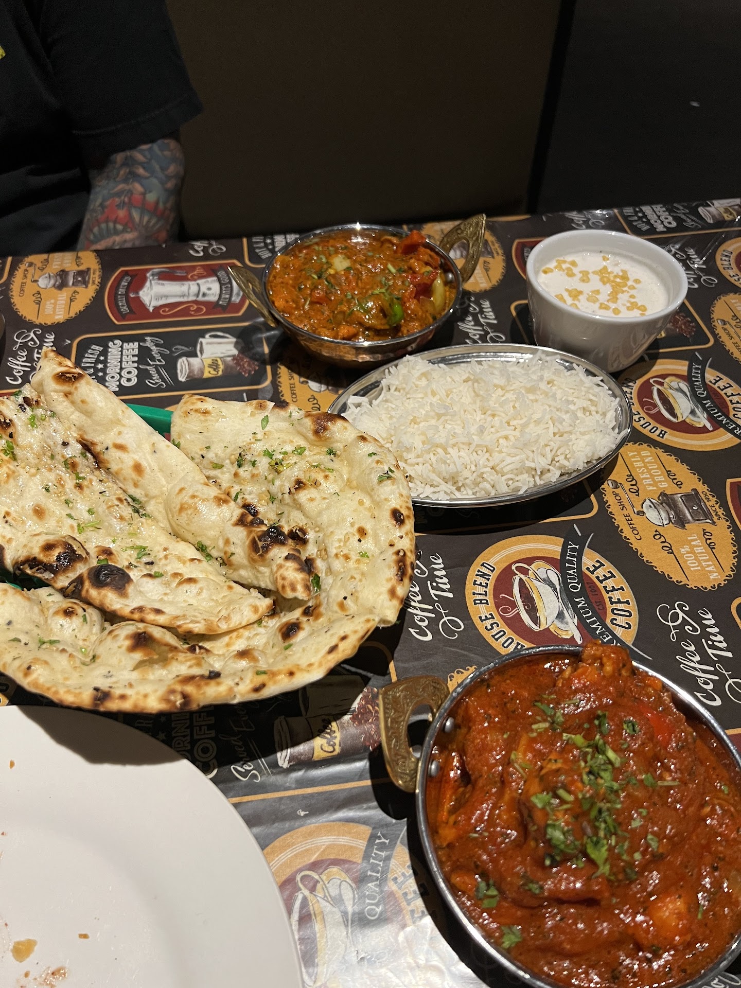 Chicken Vandaloo (tomato base and potatoes) and Karahi Chicken (peppers and more curry forward). Out of habit I always order a side of rice, naan (we went with the garlic version), and raita in case things get too spicy. We love spicy food but went with medium since it was our first time there. We definitely could have handled the spicy version but played it safe.