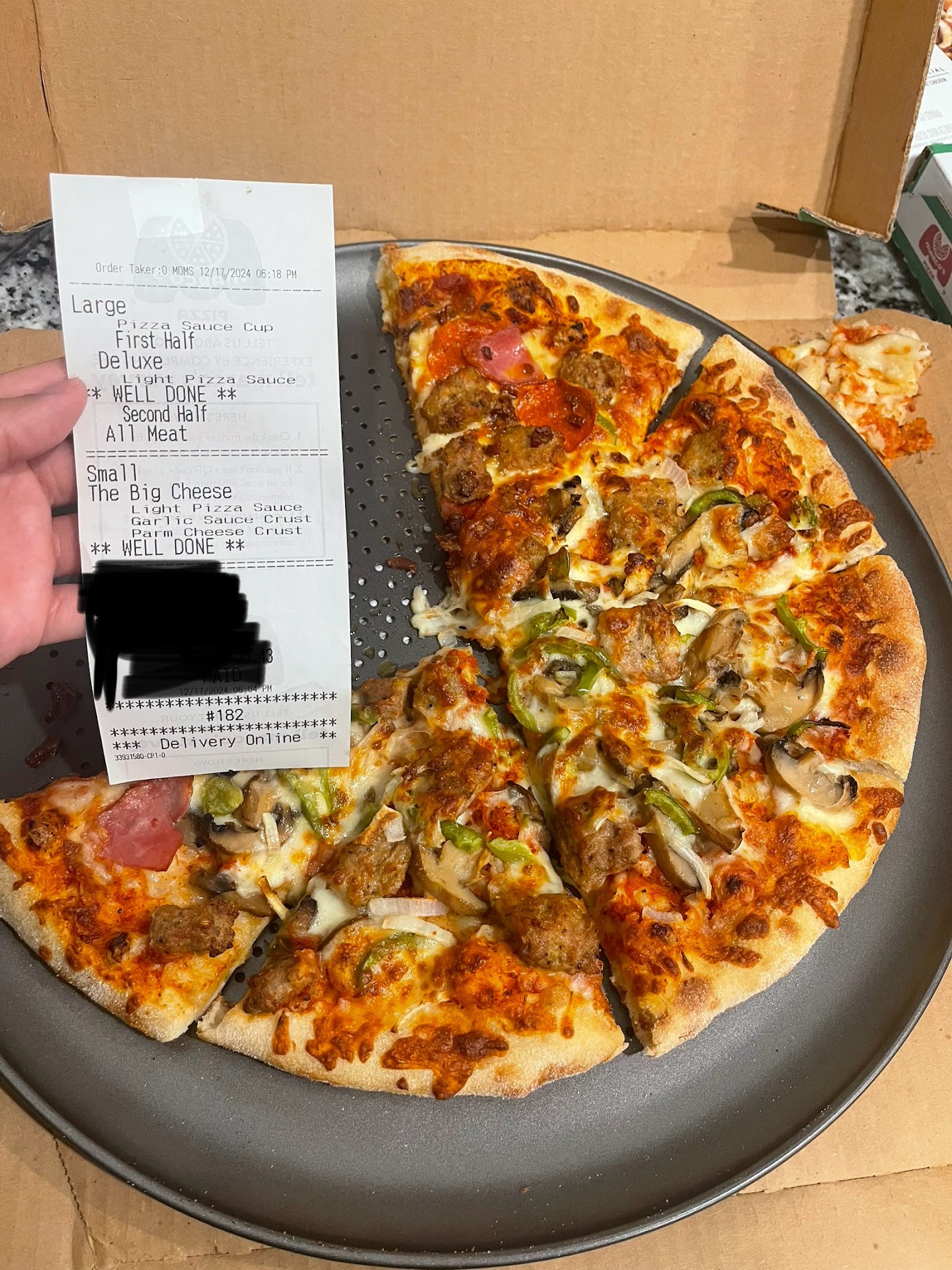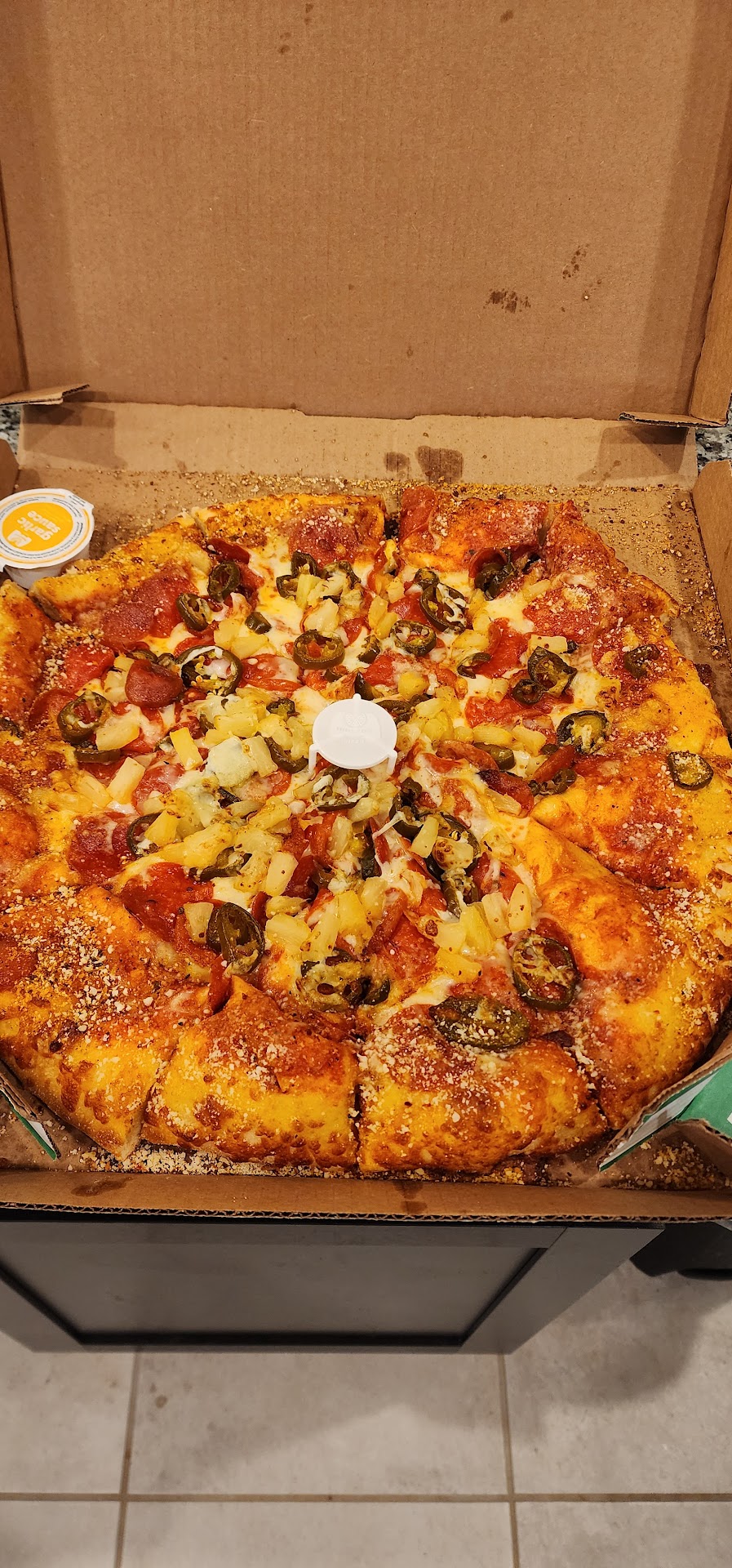 Read moreOrdered using their website at 6:54 pm. Promise time of 7:34pm. At 8:10pm, 40 minutes after promise time, I have to call the location to find out where our food is just to be told the driver left 20 minutes ago. When we receive the food, the driver appologizes for the delay saying he is not the normal delivery driver. We received the food and upon opening the pizza box, find out it is missing 1/4 of the cheese. So, nearly 1 hour and 15 minutes waiting for a 30 minute promise time just to receive a portion of what we ordered. Either be ontime with a portion of the food or delayed with the complete order, not both. If you're going to be late, CALL THE CUSTOMER. Very disappointed. Also, this is not the first time with this location. We have ordered pick-up in the past just to find out they made a vegitarian lovers instead of a meat lovers. We were told we were "put on a list" for a free one next time, but that was just a lie. Left 2 stars on the atmosphere assuming their atmosphere matched their service and their product...