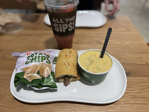 Read moreGranted, it's been years since going to a Panera, so I was looking forward to treating myself to this new location near me. I always thought of going to Panera was a destination dining, an experience, and this fell way short. This location is set up it seems to cater to drive thru and pick up. One way parking lot flow as well. I dined in and they have kiosks to order. It been a while like I said, so it took a bit to navigate through. Then it asks for a tip at the end, and I had yet to have any human interaction. Then when done it wanted me to rate my experience....really. I just bypassed instead of a one starring it. I got a sandwich and soup, and a drink and pastry for dessert. Out of baguette at 1130am by the way for the soup. The food was great as Panera does, but likely won't be much of a regular. Maybe a drive thru hear and there, but overall disappointed, especially the excitement in seeing one open near my area. Do old style Panera's...