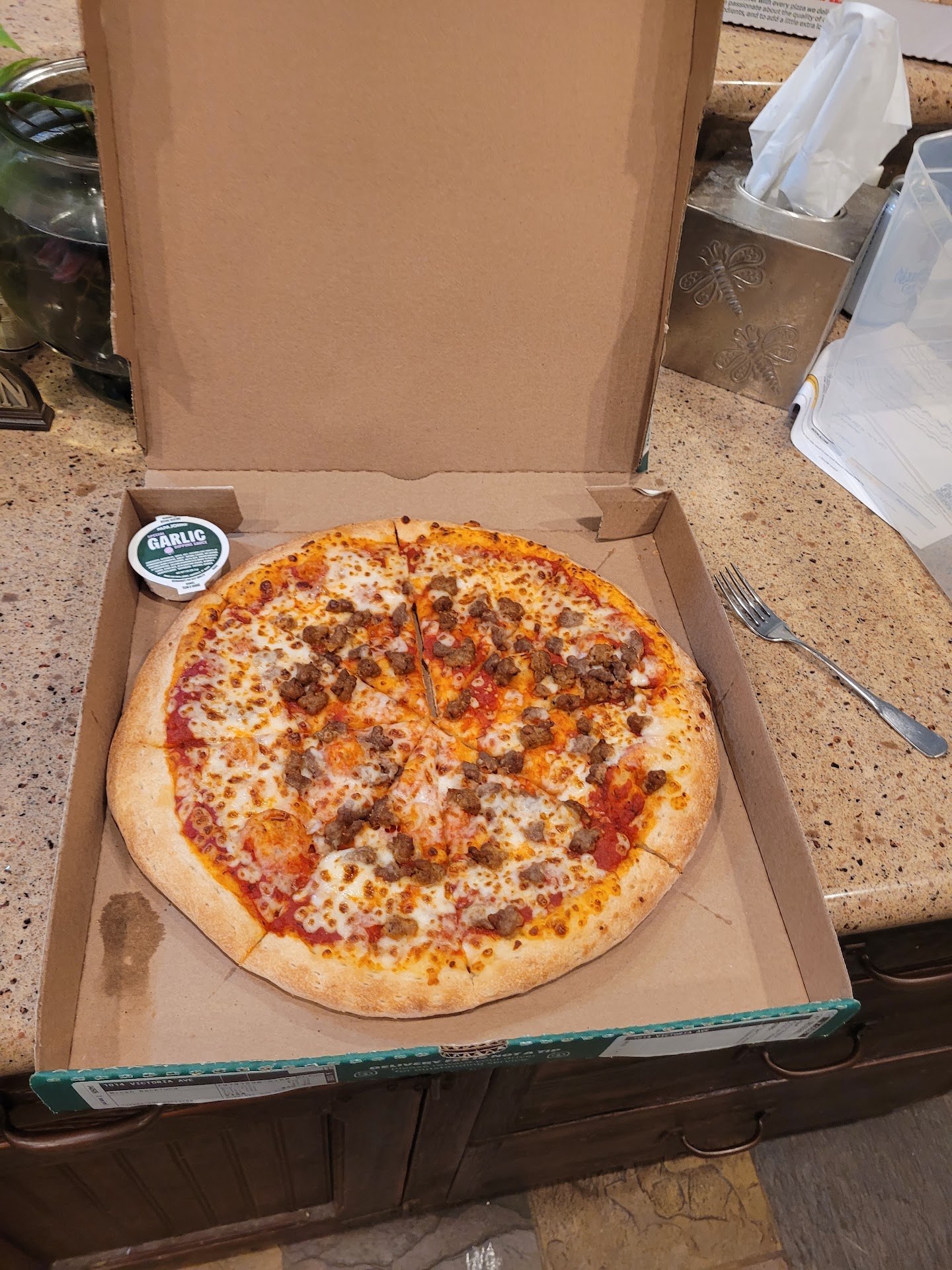 We ordered from this Papa John's a few times. Never really had any issues until this last order. We were picking a few things from HEB and when walking out, we remembered there was a Papa John's next door and decided to place a walk-in order. I wish I can give the gentleman that took my order a five-star rating because his customer service skills were amazing. The pizza was delicious. My wife, my two kids, and I all woke up in the middle of the night in tears. Our tummies felt like someone punched us. We all felt like throwing up. We all spent hours in the restroom. The next day, we were all fine. Everyone ate a different breakfast and lunch. The only thing we had in common was dinner, pizza from Papa John's. Again, this is the first time this has happened to us. We ordered about five times from this location. The employees are amazing. With that said, I called the manager the next day. Very nice, I let him know that my intentions are not to cause any issues. I let him know the pizza was delicious and the employees were amazing. I let him know we are all fine, but something was not right with the pizza. I gently asked if he would take a moment to inspect the food to make sure no one else gets sick. That is the only purpose for my phone call. Not to cause any issues. He got very defensive, cut me off, and repeated multiple times.......no one else called to say they were sick. I again asked for him to look into it to avoid any issues in the future. If not, that's ok too. I was just trying to be nice and hung up. Before I hung up, he said he would look into it. Maybe this was just a one-off, but we are all too scared to eat here again. Manager's attitude is pretty rude. If you don't believe me, before placing your order, hit option 5. Takes you directly to the manager. Ask any questions. You will see how nasty his response is. Pretty sad considering the employees in the front are busting their tails...