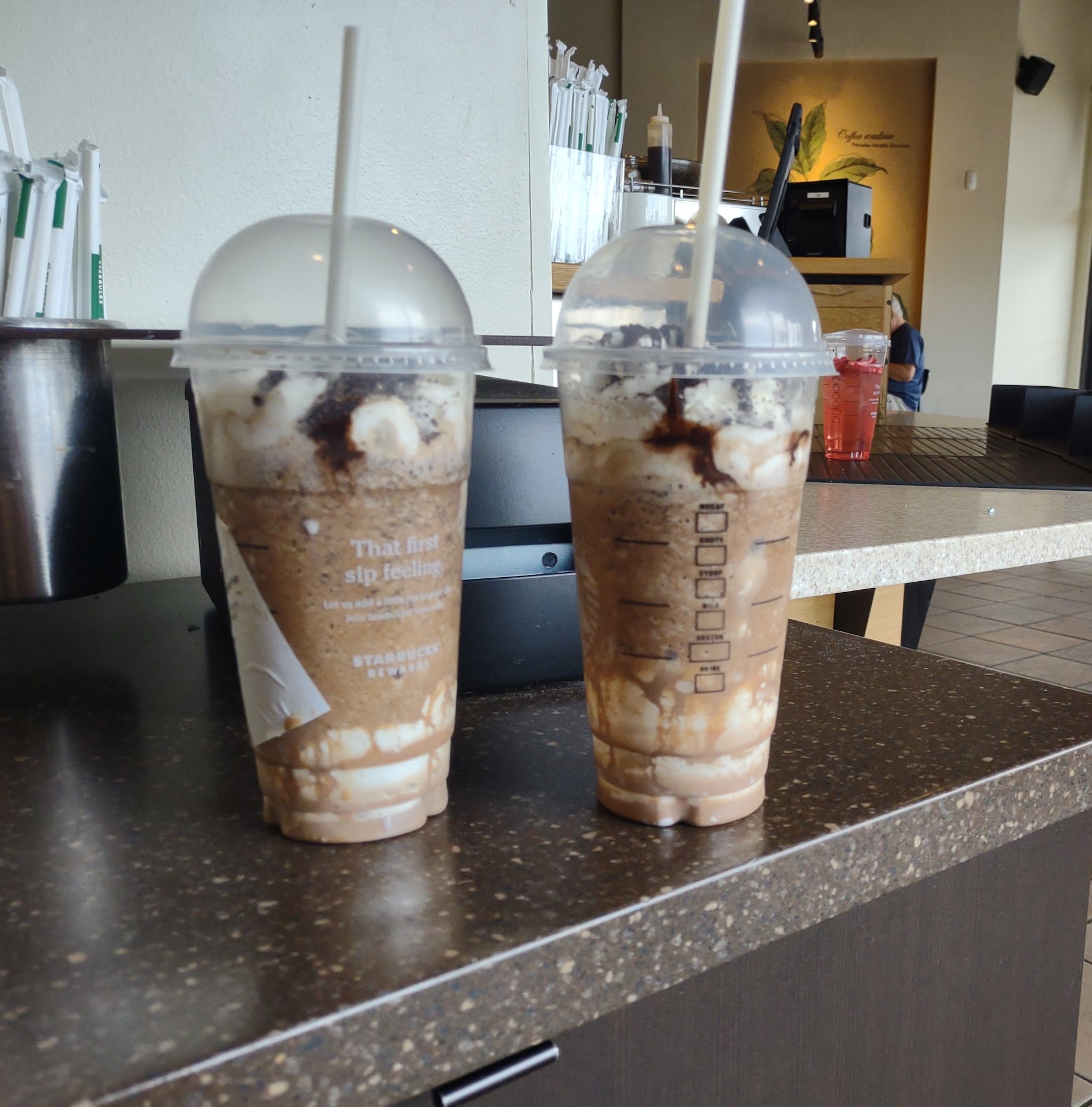 Our drinks were missing quite a bit of drink. I thought Starbucks may have started giving you less like so many other companies are doing these days. I watched other drinks coming out and about half the frappuccinos I saw go out were like ours about half were actually full. I went up to the counter to ask for a cup of water and waited several minutes to be acknowledged. Pretty much every employee looked at me standing there and not one could bother to acknowledge me. One young lady was just standing around and looked at me at least three times. It was busy and I understand having to wait a minute or so for someone to help but basic customer service dictates that you tell a customer someone will be with them in just a moment, you don't look at them repeatedly and act like they are not there. The included picture was taken before either of us took a drink as you can see this was definitely a shortchange...