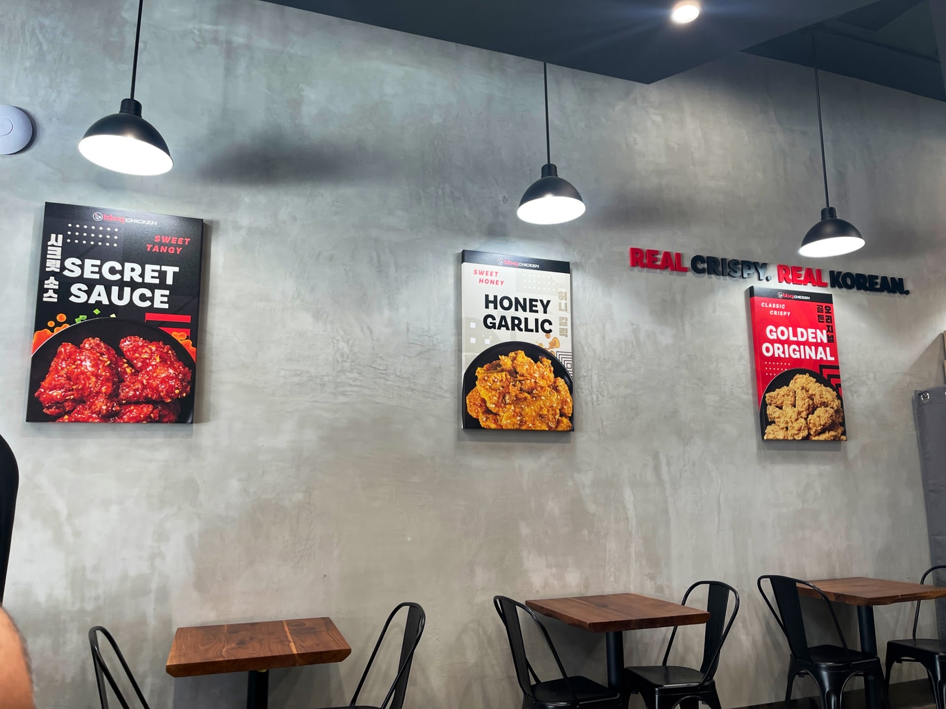 We’d heard about this place opening not too long ago, and after seeing that not much has been said about it, I decided to try it out and get these reviews started. We went on a weekday at around noon for brunch. Upon entering, it’s a nice well-lit interior with several different types of lighting fixtures, and a selection of music playing over these. The place where the customers are to be is VERY clean, and nice-looking. 5/5, nice, welcoming and hospitable atmosphere. Upon approaching the cashier, he greets and welcomes us. We look at the menu and order the Rosé Tteok-bokki and a whole chicken- 1/2 bone in original and 1/2 secret sauce. We didn’t get drinks, but they had several sodas which had diet and zero alternatives, along with several waters, teas, and juices. When we order, he is very polite and clear in speaking, and give us an estimate of our order time- 20 minutes. 5/5 service. I did need to use the restroom while waiting, so I’ll give you a few details. There are two single stall restrooms, each with a rustic-type theme, using pipes and wooden frames to decorate. There is plenty of space, and toilets are clean, although there is a strange stench about the air. The food did take about 45 minutes to be ready, though, to the point that around 6 people that were behind us in line got their food before us. This will sadly bring my service score down to 3/5 :(. We took it home to eat, and the Rosé Tteok-bokki was very buttery-creamy, lightly spicy, and seafood-y 5/5. Original crispy chicken was very, very crispy, with a nice flavor without being oily, although a little bland. 4/5. The secret sauce chicken had a nice sweet taste, almost a citrus-fruitiness, and a VERY mild spice. The crispiness isn’t as good or even as the original, but still a good flavor. 3.5/5. So, overall, I would say the food...