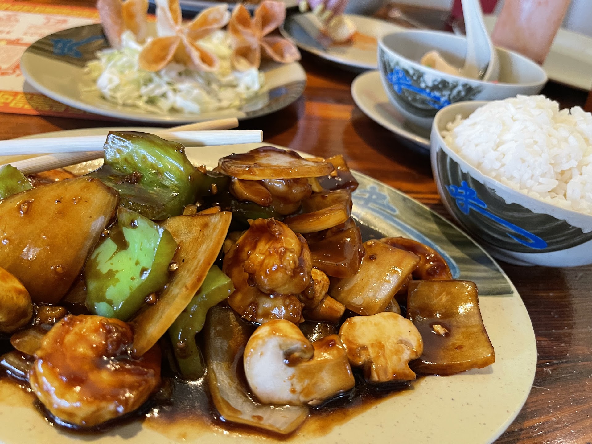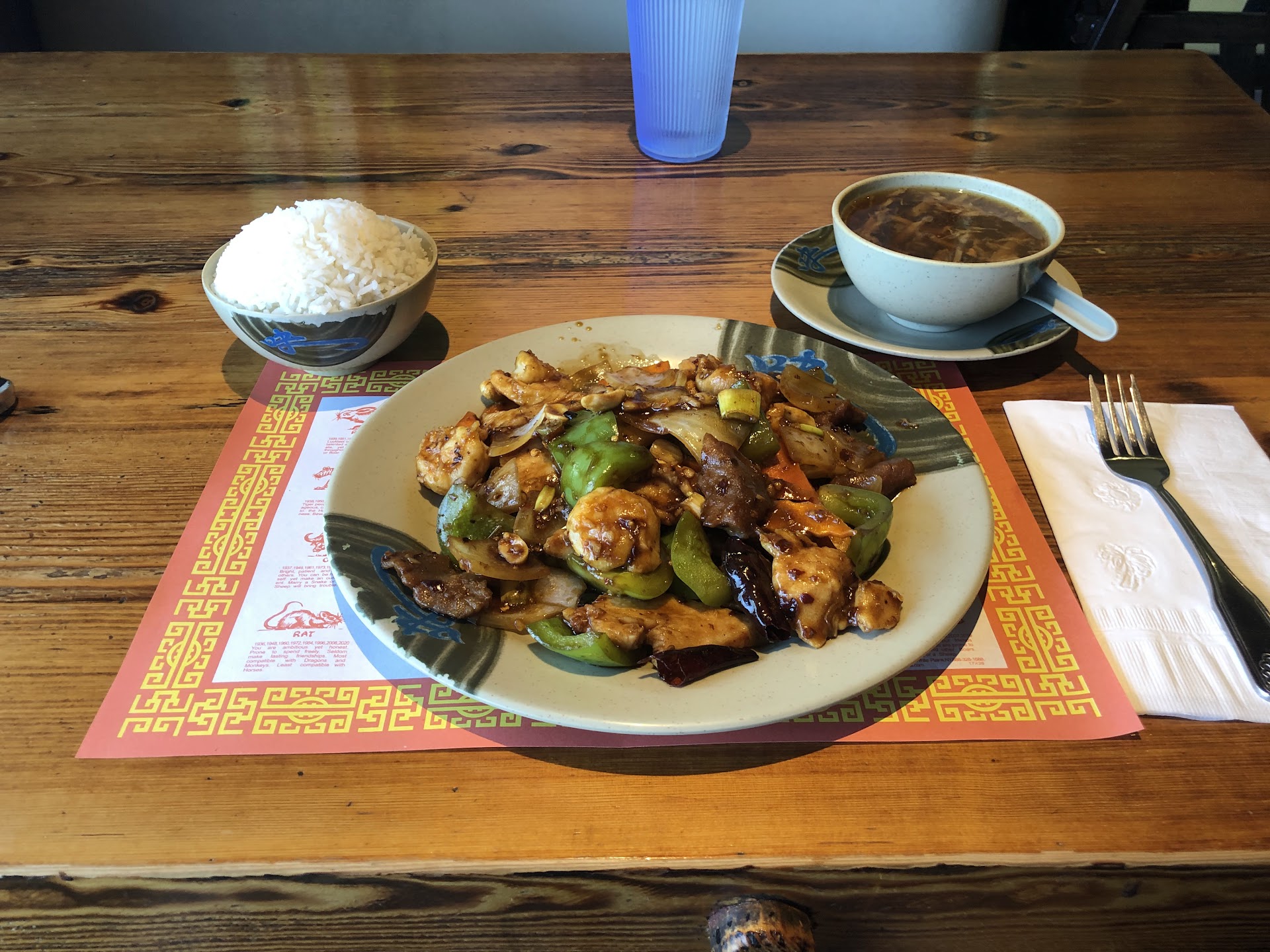 We decided to try the cream cheese wontons which were delightful. Perfect balance of sweetness. I ordered the lunch special: chicken with string beans, it also came with rice and soup or salad. I picked hot and sour soup. It hit the spot! My bf ordered the shrimp something, which I think wasn’t a great idea because he hates onion, and it had slices on onion and bell pepper lol. The house ice tea was good, not great just ok.