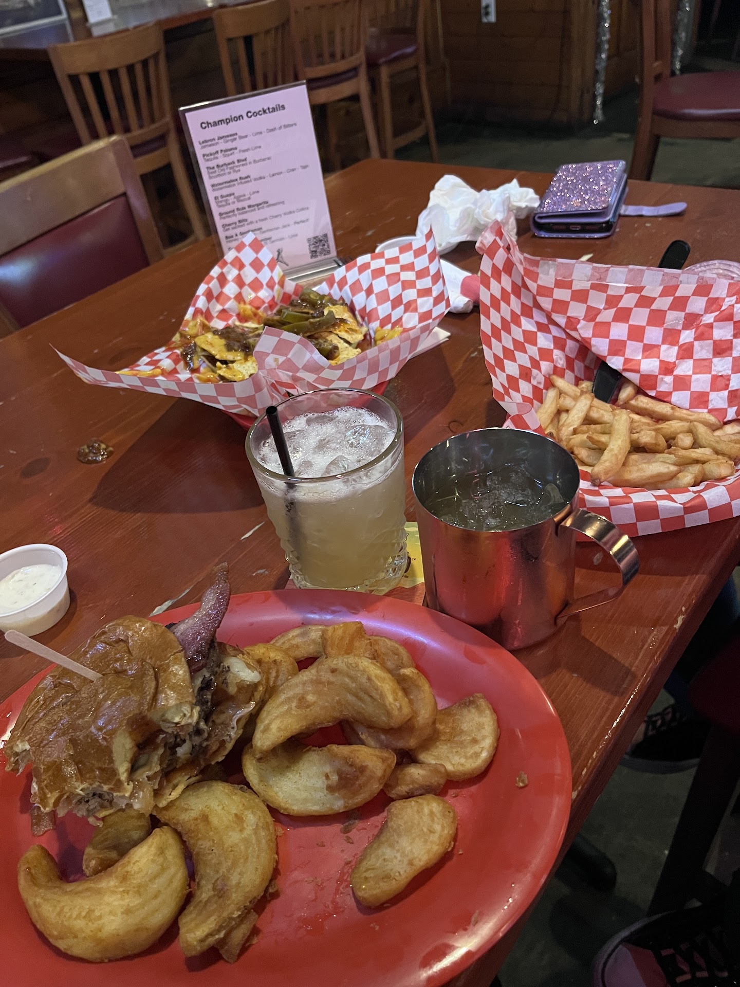 The food was outstanding! We had the Champs burger with regular fries, the Western burger with sidewinders, and ballpark nachos. Our only regret was getting chili on the ballpark nachos, but that was our choice. With everything we ate and the drinks we shared, our tummies ended up being a little angry about that chili (remember Grandma’s Boy?).
