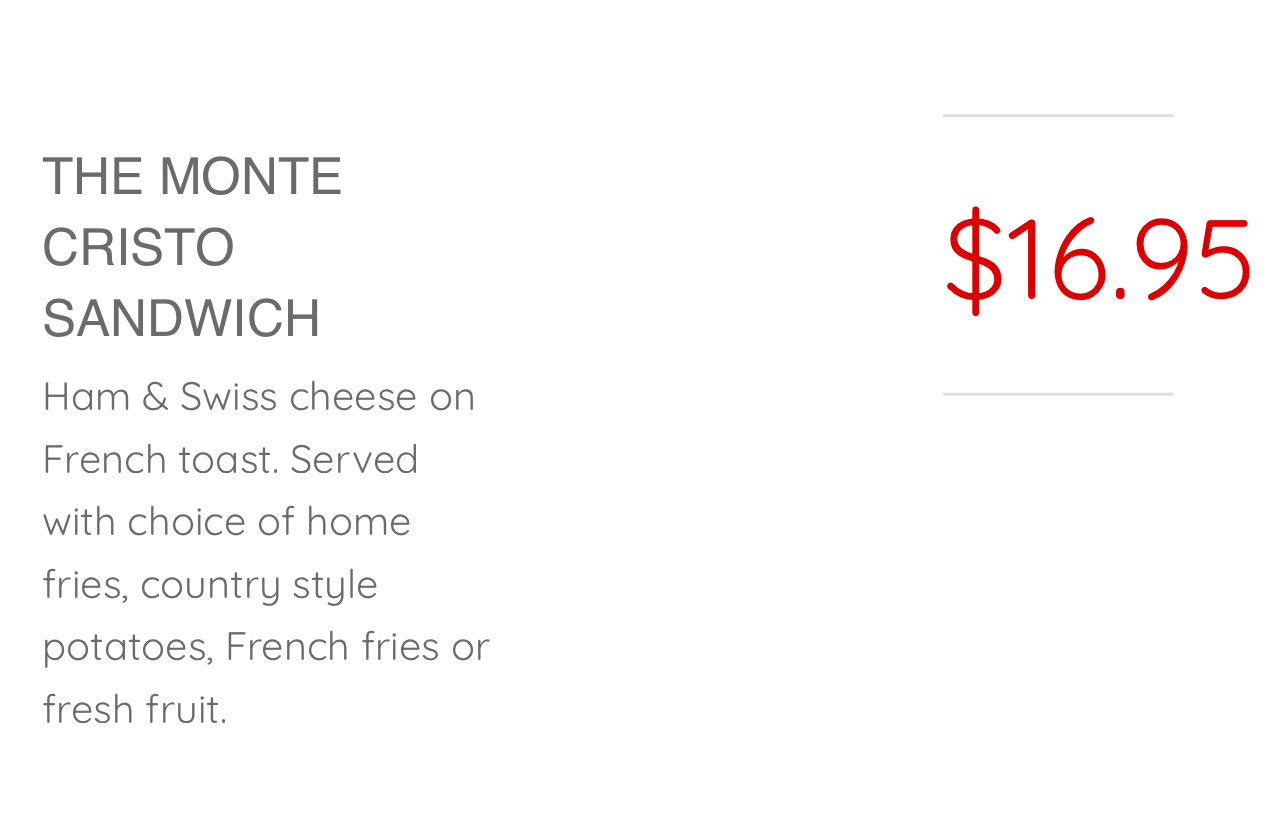 Responding to your response: Look at the picture attached of your menu description for The Monte Cristo and tell me where it indicates there is an extra $2 dollar charge for country style potatoes. It literally says verbatim "served with choice of home fries, country style potatoes, french fries, or fresh fruit." Saying it's "served with" indicates that it comes with these things, it does not say there is an extra $2 charge for them. When you change the menu to say "it is an extra $2 to add home fries, country style potatoes, french fries, or fresh fruit" then I will...