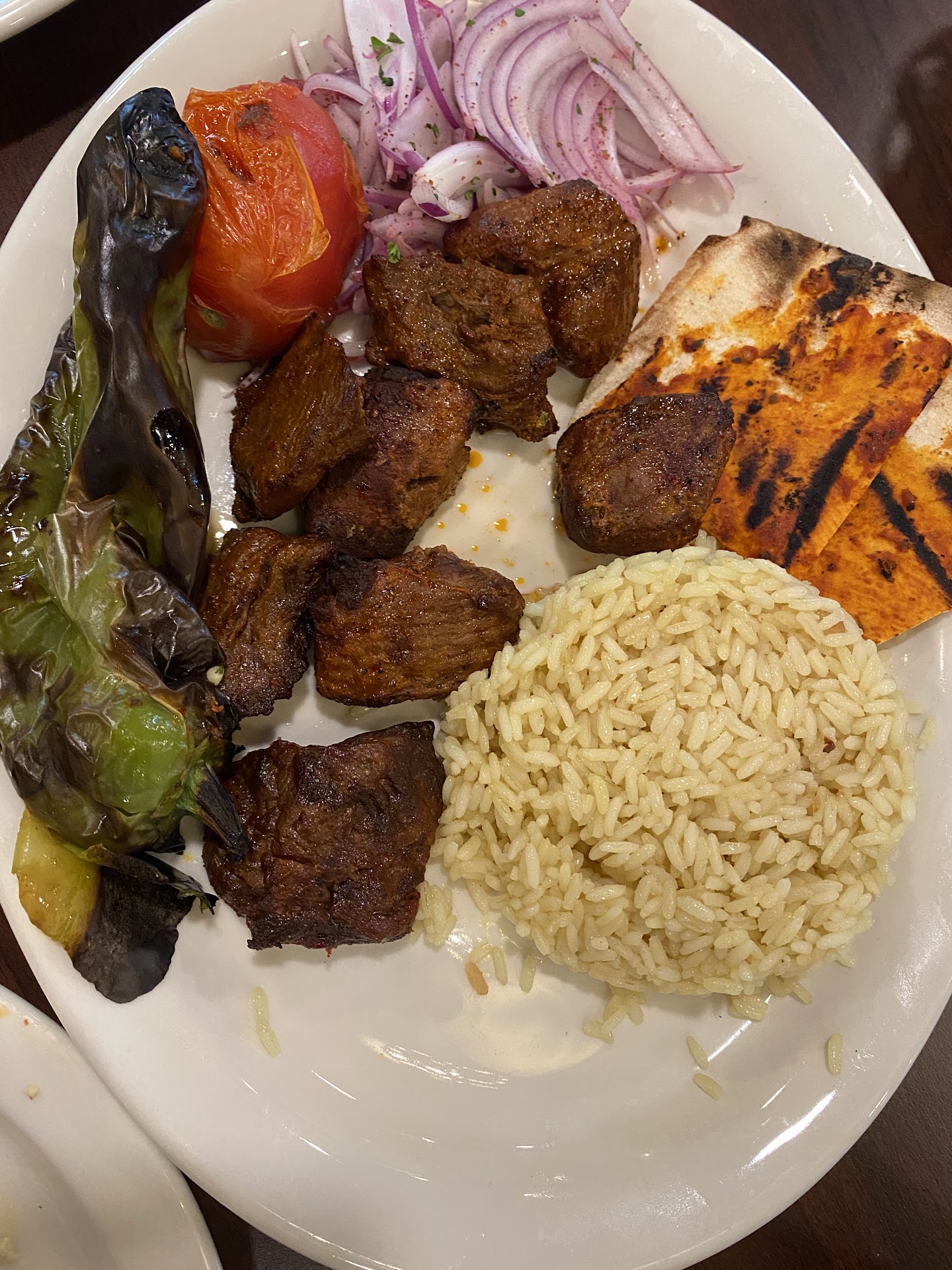 Cons: the food came out too quick and the service was too slow. We went on Valentine’s Day and it seemed they were understaffed or we were working with an inexperienced waiter because we had to make eye contact EVERY SINGLE TIME to get our waiters attention - in total we were there for one hour and 45 minutes, not ideal. While the service was slow, the food came out too quick, let me explain. We ordered the pre-fixed meal and so first they brought out the pita and cold appetizers. Then a few minutes later, they brought out more food and then nearly 3-5 minutes later when we hadn’t finished anything, they brought out the heated food aka the main dishes with Chicken Kabob, Chicken Skewers, rice and veggies. However we didn’t want the food to get cold and our table had no space for all that and drinks. So after 10-12 minutes of trying to get our waiters attention, we ere finally able to get them to take the warm food back in the kitchen. Another con is the rice was plain and we told them we didn’t eat beef and they still gave us a beef appetizer dish which then took another 10-12 minutes to remind them we are not red meat eaters to get that taken away and replaced with more falafel balls, which we’re okay but certainly can count better falafel balls I’ve had in my life time.